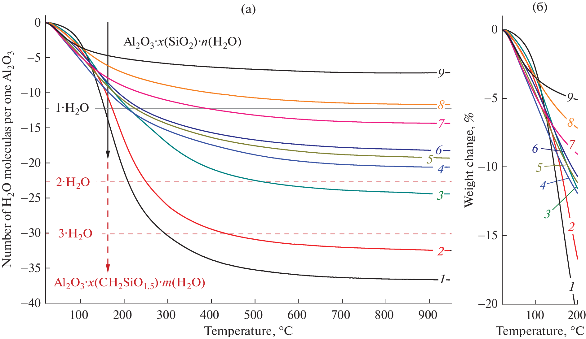 Changes in the composition and physicochemical properties of porous monolithic 3D nanostructures of aluminum oxyhydroxides (porous monolithic aluminum oxides, PMAO) chemically modified in methyltrimethoxysilane vapors have been studied by thermal-analysis methods. The conditions of formation and compositions of organosilicon compounds on the PMAO surface have been determined, a high degree of hydrolysis (91%) of the alkoxy groups of the modifier during chemisorption has been confirmed. The dependence of the composition of the porous nanocomposite structure (Al2O3–SiO2) on the conditions of chemical and thermal treatment has been investigated. General changes in the chemical composition of the nanocomposite when using different annealing times in the range from 100 to 1200°C has been described.