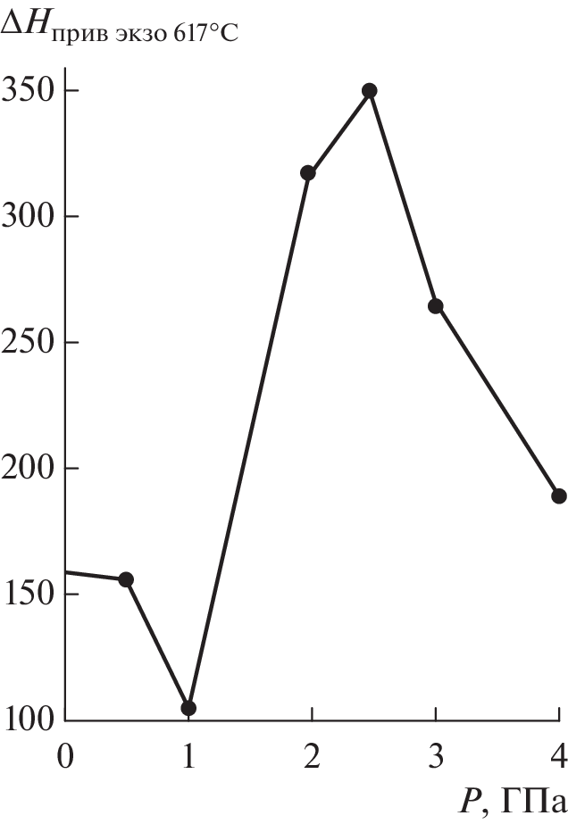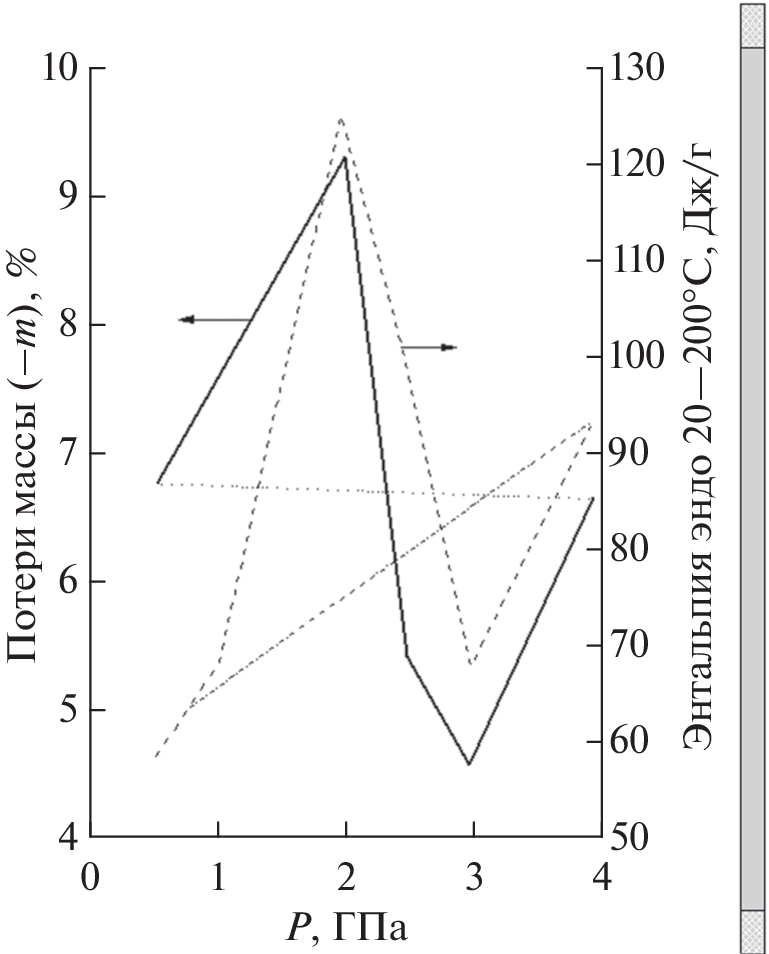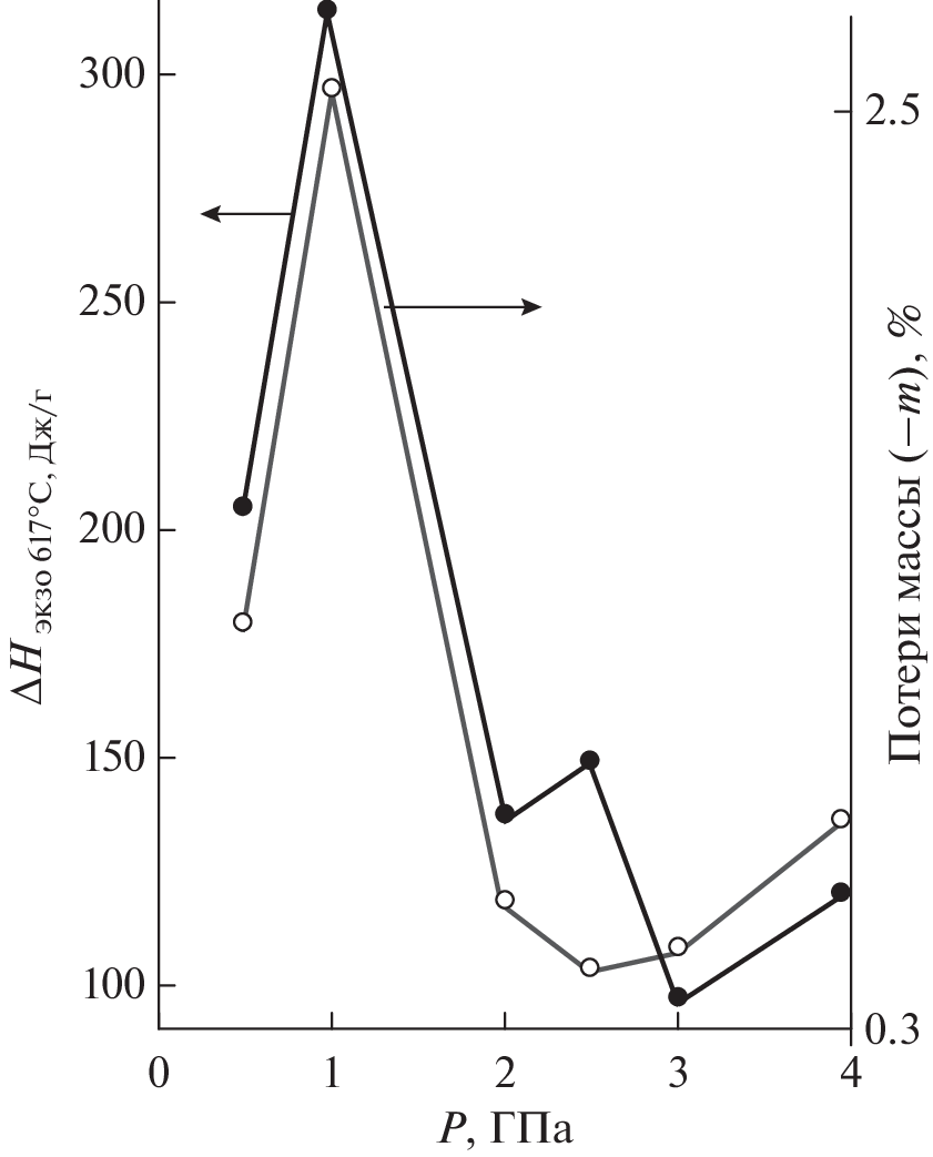 Thermally stimulated processes in mixtures of boric acid (BA) with aluminum after plastic deformation under a pressure of 0.5–4.0 GPa were studied by differential scanning calorimetry (DSC) and thermogravimetry. In the original BC, in the range of 20–200°C, splitting of water occurs, accompanied by an endothermic effect. In deformed mixtures BC–Al = 50–50, the endoprocess was recorded on DSC thermograms in the range of 20–200°С, an exoprocess in the range of 200–550°С, an aluminum-oxidation exoprocess at 620°С, and an aluminum melting endoprocess at 656°С. The baric dependences of the parameters of thermal processes in deformed mixtures exhibited extrema at pressures of 1.0 and 2.5 GPa, which were associated with changes in the electronic structure of aluminum caused by high pressure. Such changes can be retained in deformed mixtures after completion of pressure treatment and manifest themselves upon heating due to the formation of electrical double layers in mixture samples.