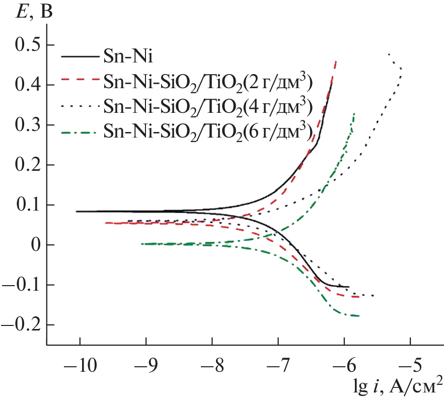 Composite electrochemical coatings based on a tin–nickel alloy with a composite of the “SiO2 core–TiO2 shell” type have been obtained. Corrosion properties of coatings were studied in 3% sodium chloride solution. Biocidal properties of coatings with respect to Escherichia coli ATCC 8739 and Staphylococcus aureus ATCC 6538 strains were studied. It was found that, to impart biocidal properties to the surface, the minimum concentration of composite in the electrolyte should be 4 g/L.