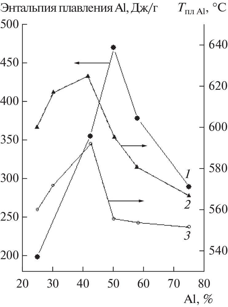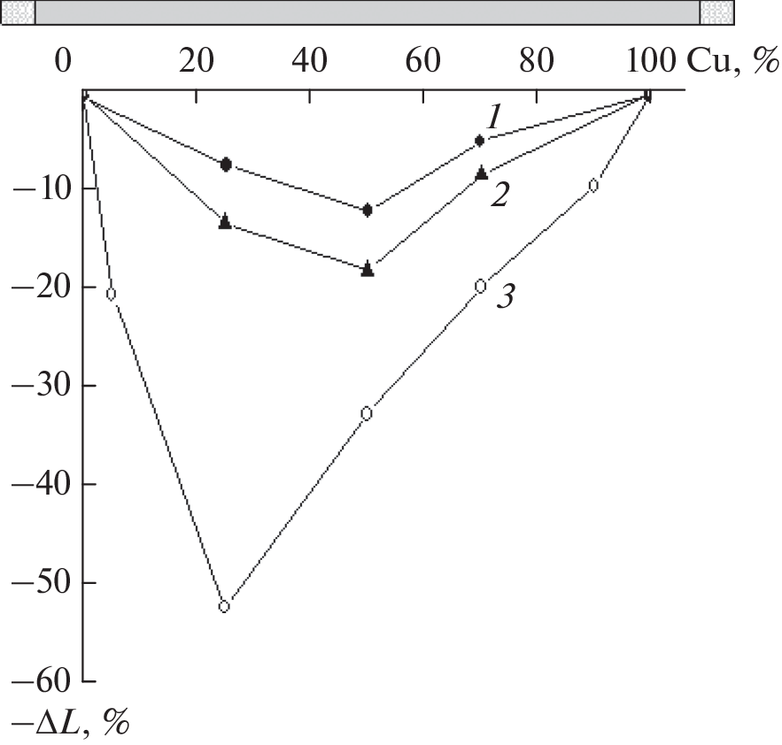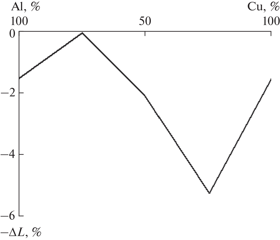 Mixtures of Al–Cu powders of various compositions were subjected to plastic deformation at a pressure of 1–4 GPa in an anvil-type high-pressure apparatus and studied by the thermomechanical method, as well as by differential scanning calorimetry (DSC) and energy dispersive X-ray spectroscopy. When deformed samples were heated, a decrease in thickness was recorded, which reached 40%. This effect depended on the material of the anvils and the pressure at which the treatment was carried out. The DSC study showed that, upon heating, an exothermic process occurs in the samples in the range of 168–180°C and a high-temperature endothermic process of aluminum melting takes place. The concentration dependences of the enthalpy of the processes had an extreme form. An electron-microscopic study found that, as a result of pressure treatment in the samples, the ratio of components changes and a new phase is formed, the amount of which increases with increasing deformation pressure, which is a characteristic feature of a chemical process.