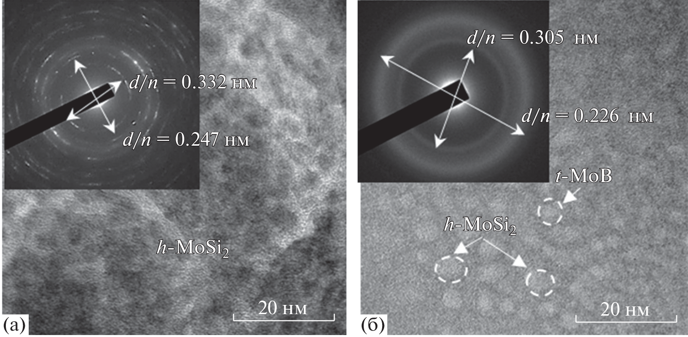 The Mo–Si–B and Mo–Y–Si–B coatings were obtained by magnetron sputtering in the direct-current mode using a 90% MoSi2 + 10% MoB target equipped with yttrium segments. The composition and structure of the coatings were studied by scanning electron microscopy, X-ray phase analysis, and optical emission spectroscopy of a glow discharge. The diffusion-barrier properties and heat resistance were evaluated by annealing at temperatures from 700 to 1000°C. The thermal stability was determined by heating the coating lamellae in a column of a transmission electron microscope in the in situ mode. According to the chemical analysis, the main elements were evenly distributed over the thickness of the coatings. The coating growth rate did not change upon the introduction of yttrium and was in the range of 325–350 nm/min. The Mo–Si–B coating was characterized by a columnar structure with grains of the hexagonal phase h-MoSi2 about 50 nm in size, as well as an insignificant volume fraction of the boron-containing amorphous phase (a‑MoB). An increase in the concentration of Y up to 4 at % led to a decrease in the size of h-MoSi2 crystallites of up to 10 nm. A coating with a maximum concentration of yttrium (7 at %) contained predominantly an amorphous phase a-MoB with phase crystallites dispersed in it h-MoSi2 and t-MoB. The introduction of the optimal amount of yttrium (4 at %) led to a decrease in the thickness of the oxide film by a factor of 6 after annealing at a temperature of 800°C and by three times at 900–1000°C. The coating with the maximum concentration of yttrium (7 at %) had the best diffusion-barrier properties of all the studied samples at 700–1000°С, and also surpassed the Mo–Si–B sample in terms of thermal stability. Positive effects from the introduction of yttrium into the composition of the coatings were connected with (a) structure modification, including suppression of columnar grain growth; (b) transition to a structure with a higher volume fraction of the amorphous phase; (c) isolation of grain boundaries and lengthening of the diffusion path of metal atoms from the substrate; and d) formation of protective surface layers on based on yttrium oxide when heated in air.