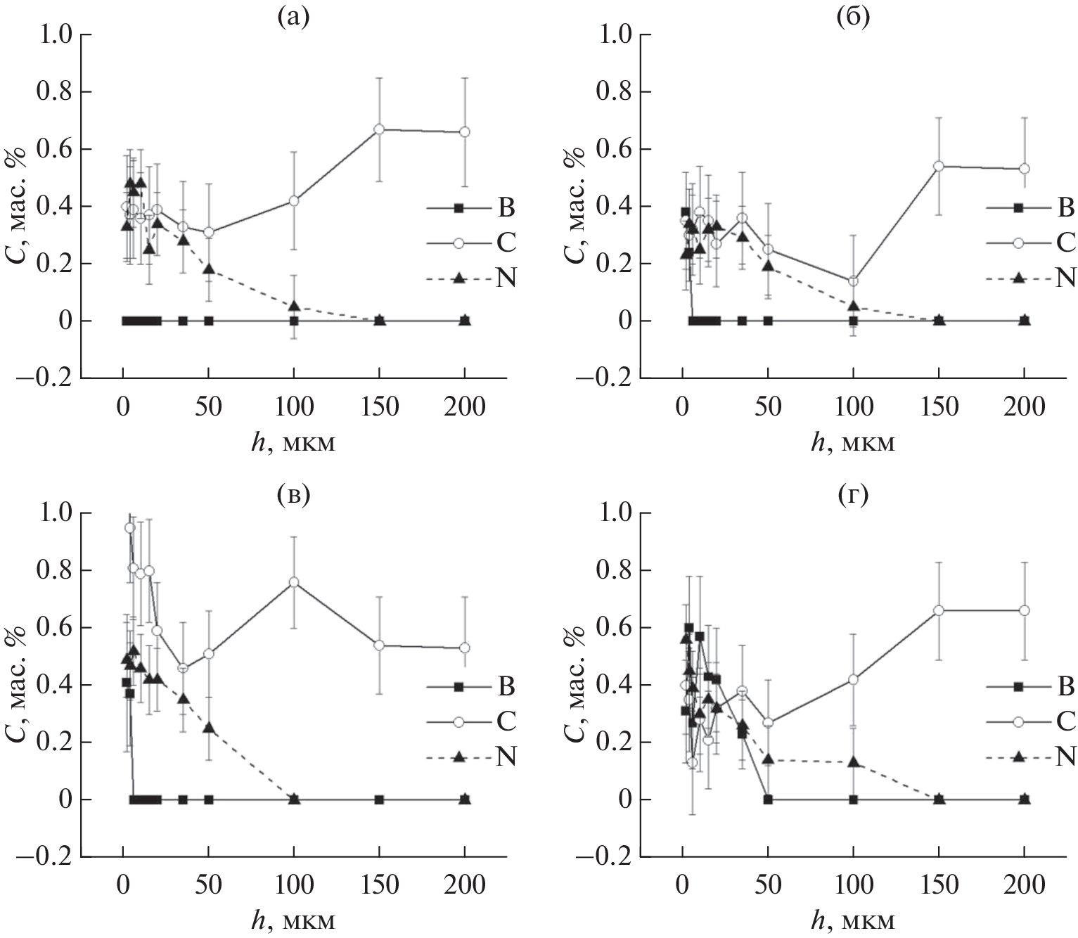 Изучена возможность повышения износостойкости среднеуглеродистой стали с помощью катодного электролитно-плазменного бороазотирования в водном электролите борной кислоты и хлорида аммония. Исследовано влияние процессов диффузии, высокотемпературного окисления и эрозии на морфологию и шероховатость поверхности, состав и структуру диффузионных слоев. Рассчитаны коэффициенты диффузии бора и азота. Установлено влияние диффузионных процессов в поверхностном слое стали на ее упрочнение при закалке, вызванное образованием азотистого мартенсита и боридов в зоне диффузии бора и азота на глубине до 100 мкм и увеличением концентрации углерода на глубине от 150 до 500 мкм за счет обезуглероживания поверхности. Установлен механизм изнашивания бороазотированной стали, соответствующий усталостному износу при граничном трении и пластическом контакте. Показана возможность повышения износостойкости в 3.5 раза и микротвердости диффузионного слоя до 1050 HV после катодного бороазотирования при 850°С в течение 30 мин.