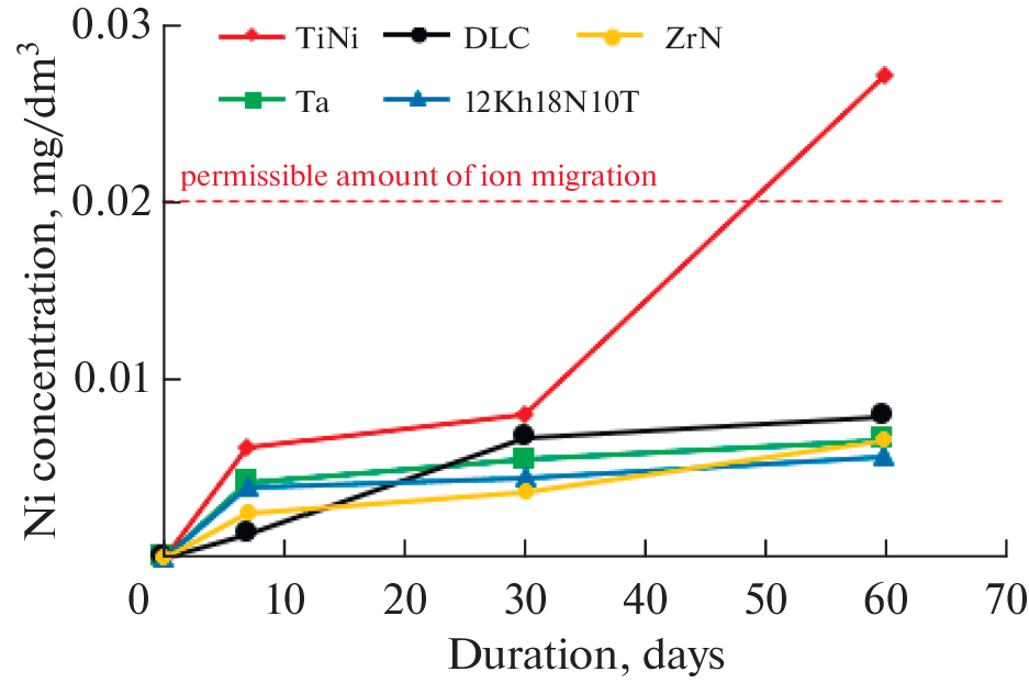 A comparative analysis of the barrier properties and corrosion resistance of bioinert coatings of tantalum, zirconium nitride, stainless steel of the 12X18H10T grade, as well as diamond-like coating (DLC) deposited on the surface of the medical alloy Ti–50.8 at % Ni (TiNi) has been performed. All the coatings are characterized by high barrier properties with respect to the yield of nickel in the biological medium for a long time, whereas, in the case of uncoated TiNi, the concentration of nickel in the test solution increases rapidly and exceeds the permissible amount of migration after 60 days of exposure. Electroplating TiNi–bioinert-coating pairs demonstrate a corrosive behavior determined by the nature of the coating material. The most resistant to galvanic corrosion is the TiNi –Ta pair, for which no signs of corrosion processes were detected on any of the elements of the pair after exposure in a model solution for 24 h. The pairs TiNi–12X18H10T and TiNi–DLC have shown the worst corrosion resistance among the studied pairs: extensive corrosion areas were observed on one of the elements of the pairs.