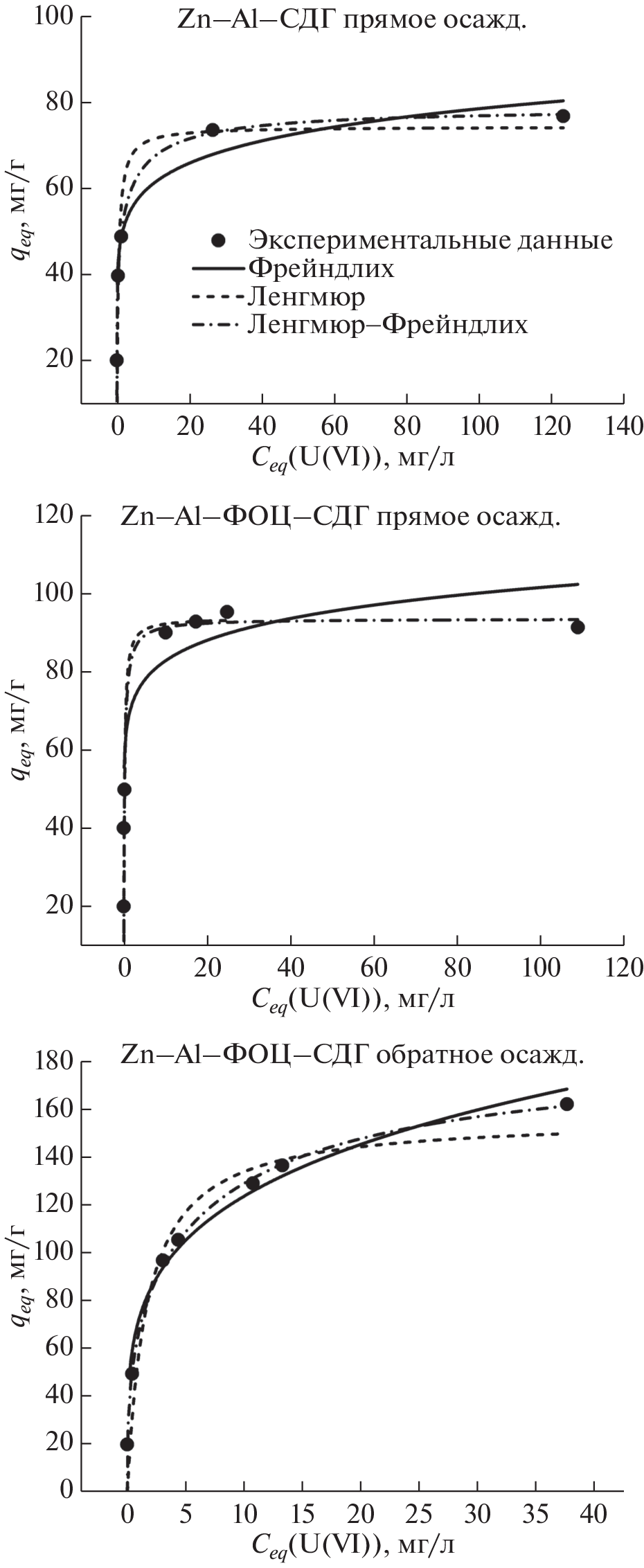 l = 156.70 ± 12.38 mg/g (at phase ratio V/m = 1000 mL/g, in a monocomponent solution of uranyl nitrate UO2(NO3)2 at a temperature T = 25°C and sorption time t = 24 h). Layered double zinc and aluminum hydroxide modified with hexacyanoferrate(II) ions is a promising sorbent for purification of liquid media from uranium U(VI) due to its high capacity and specific surface area, the possibility of effective use in a wide range of pH [4, 10], and low cost.