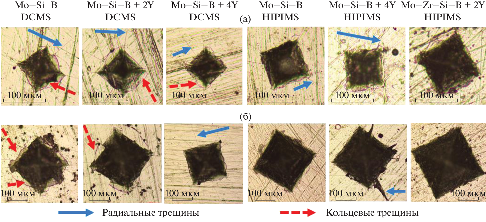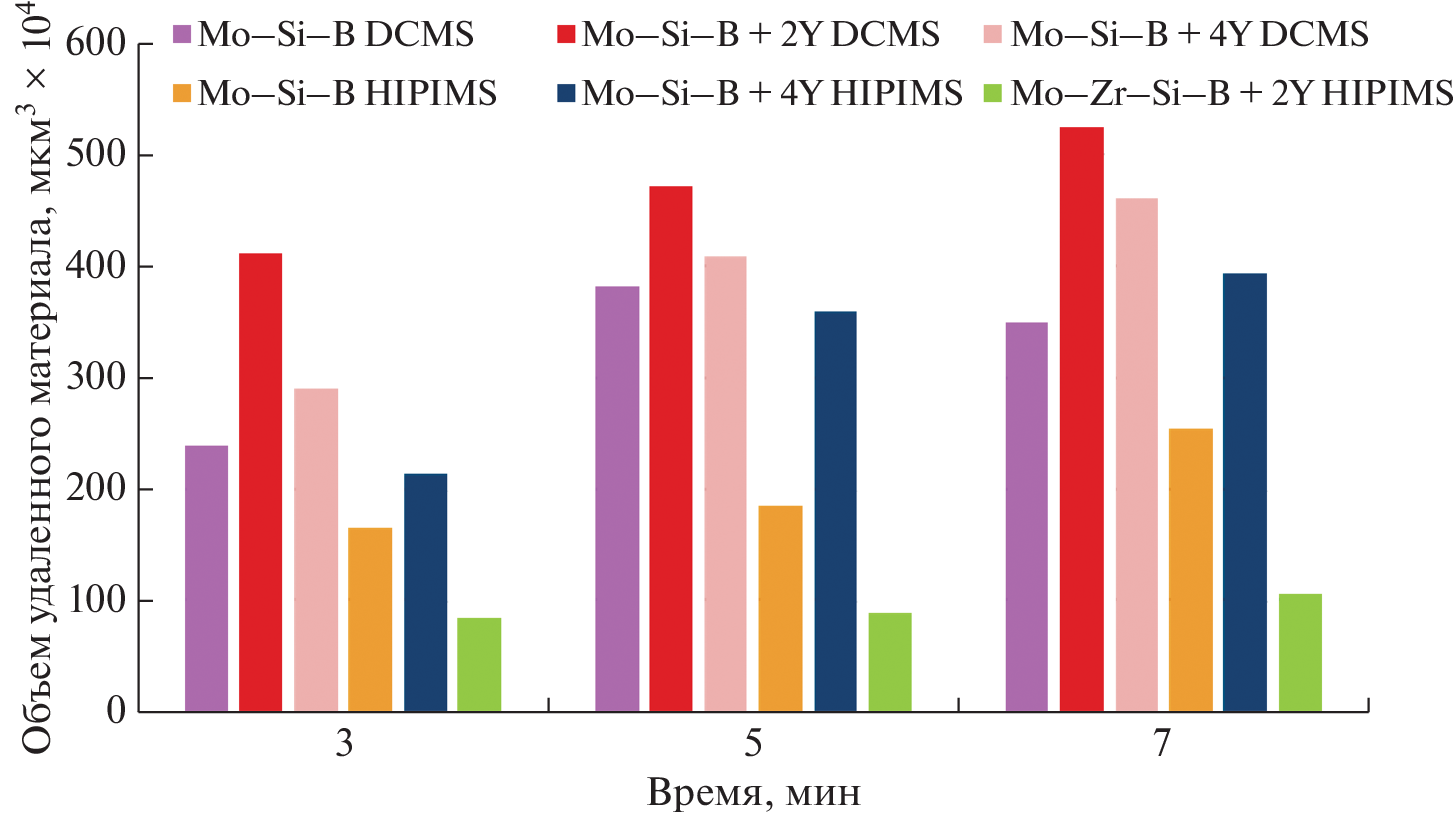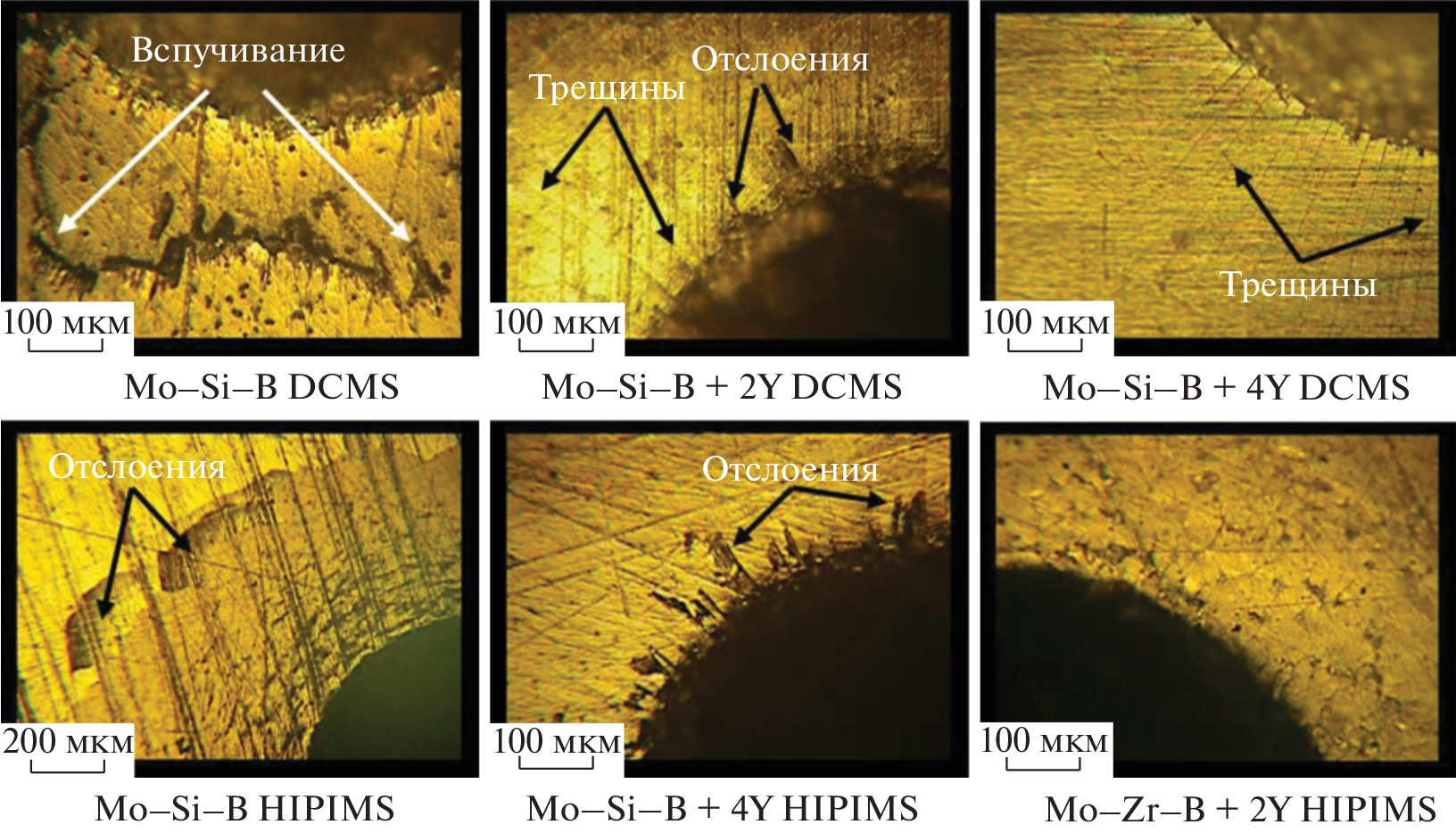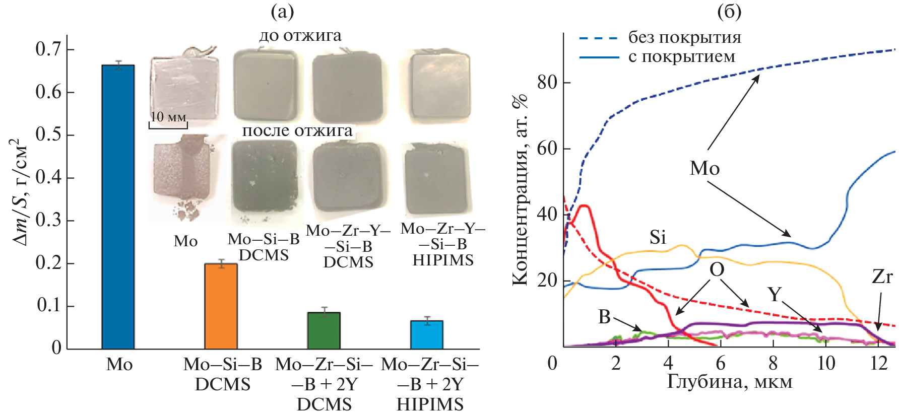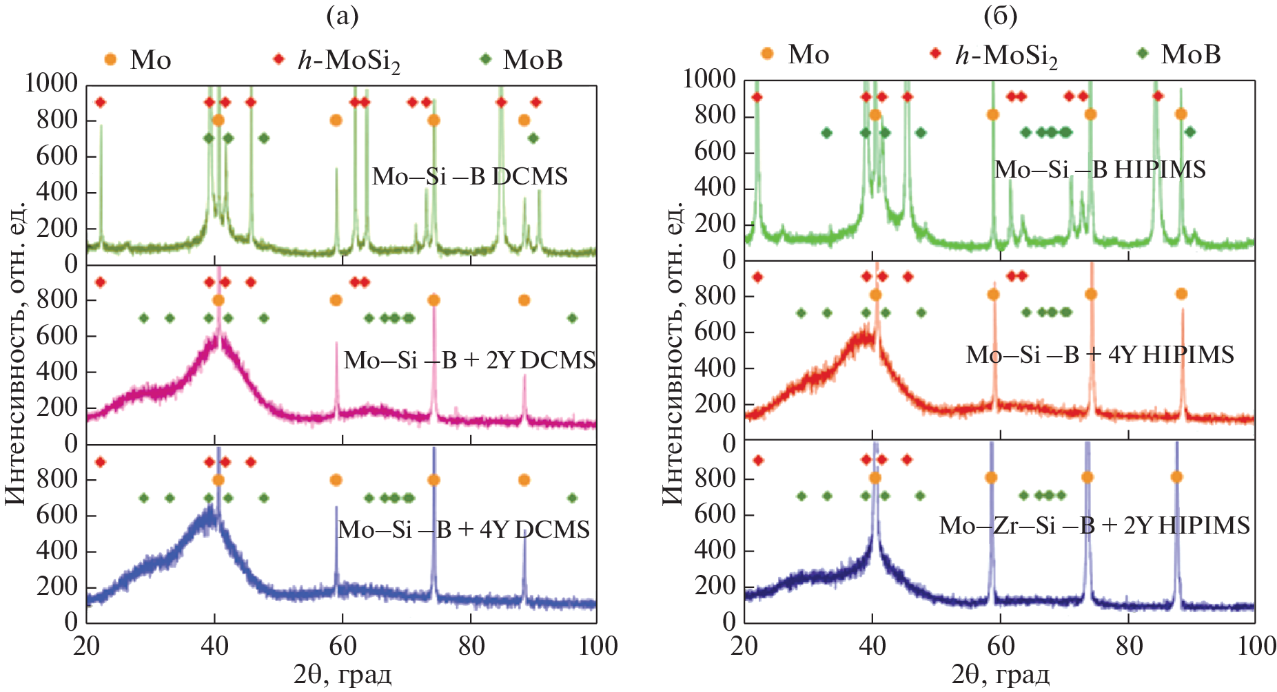 Mo–(Y, Zr)–Si–B coatings were obtained by direct current magnetron sputtering (DCMS) and high-power impulse magnetron sputtering (HIPIMS) using composite targets of MoSi2 + 10% MoB and (MoSi2 + 10% MoB) + 20% ZrB2, with the Y segments located in their erosion zone with a total area of 5 and 10 cm2. The structure and composition of the coatings were studied by scanning and transmission electron microscopy, glow discharge optical emission spectroscopy, and XRD. The hardness, elastic modulus, elastic recovery, adhesive strength, and resistance of the coatings to abrasive wear and cyclic impact loading were determined. The oxidation resistance and thermal stability were estimated by heating the coatings to a maximum temperature of 1000°C in a muffle furnace and in a transmission electron microscope column, respectively. It has been established that the Mo–Si–B coating contains the h-MoSi2 phase with preferred orientation in the [110] direction and crystallite size of 75 nm. Alloying of Zr and Y coatings, as well as the transition from DCMS to HIPIMS mode, contributed to the suppression of preferential growth of crystallites, increasing their dispersity and the volume fraction of the amorphous phase, which led to an increase in the crack resistance and adhesive strength of the coatings. The HIPIMS method in coating deposition caused an increase in the hardness and elastic modulus by 10%; resistance to cyclical impact, by 60%; and abrasive resistance, by 20%; it also increased oxidation resistance up to 20%. Mo–Y–Zr–Si–B coatings with the optimal composition demonstrated high thermal stability; the main structural component is the hexagonal phase h-MoSi2; it remained in the temperature range of 20–1000°C and also resulted in a more than ninefold increased oxidation resistance of the Mo substrate at 1000°C.