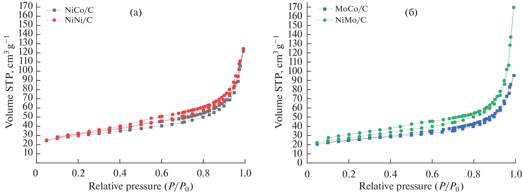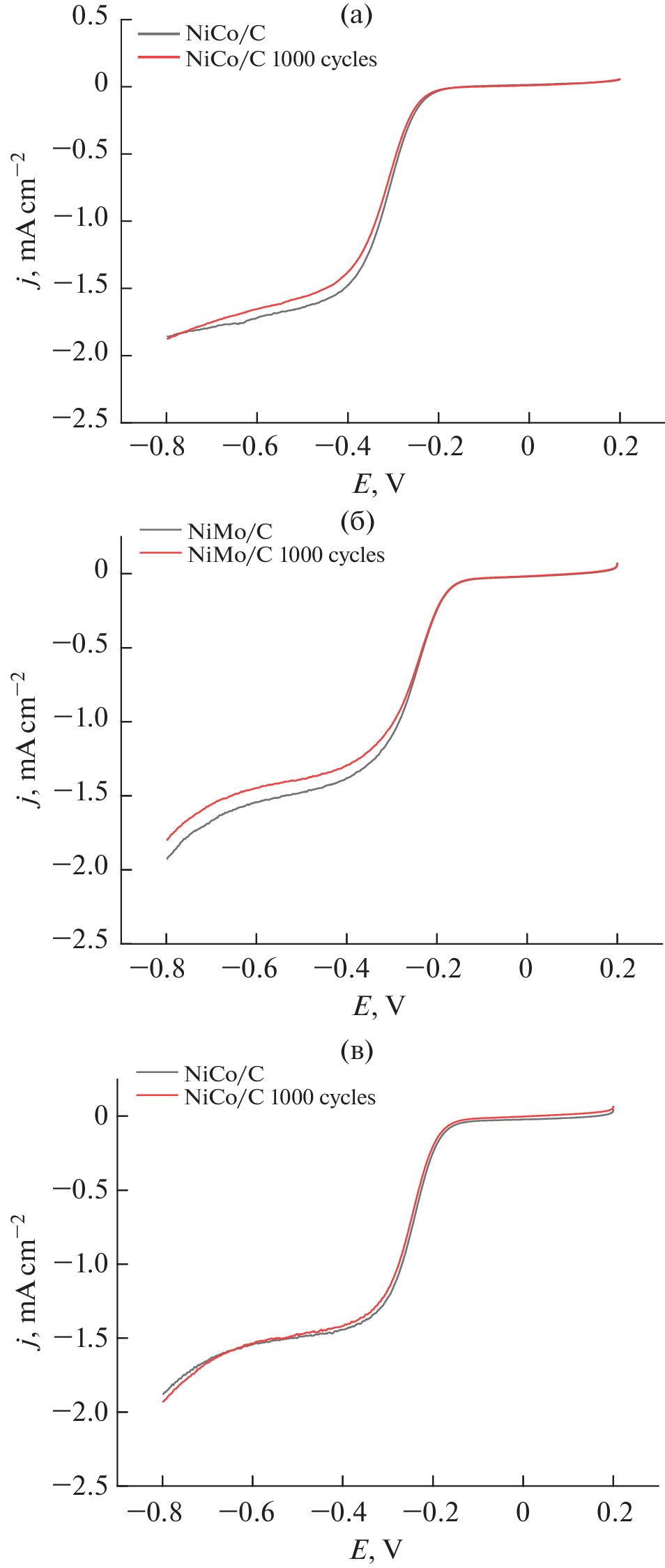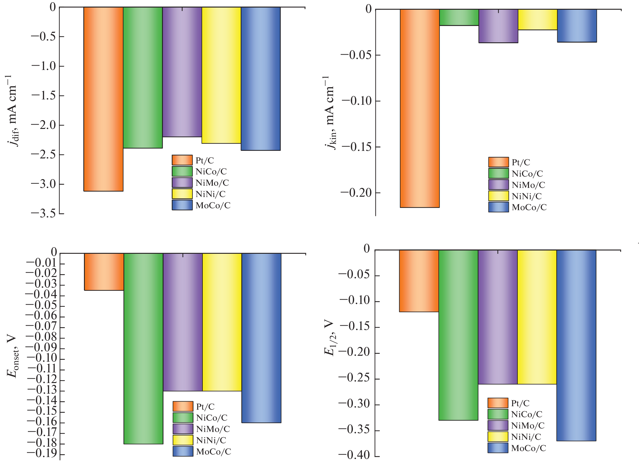 This paper presents the results of a study of the catalytic activity of bimetallic materials synthesized based on Vulcan XC-72 carbon black modified with nickel, cobalt, and molybdenum in the electrochemical oxygen reduction reaction. The studies of the synthesized catalysts by adsorption–desorption of nitrogen in vacuum show that they are mesoporous and possess low porosity and surface area. After modification with metals, the surface area of the catalyst and pore volume decrease. The Raman spectra of the samples evidence probable formation of intermetallics or mixed molybdenum oxides on the surface of the MoCo/C and NiMo/C catalysts, which is in agreement with the published data. Scanning electron microscopy shows the formation of spherical metal parties on amorphous Vulcan XC-72. All the studied bimetallic catalysts possess similar kinetic characteristics of the electrochemical oxygen reduction reaction; nevertheless, NiMo/C and NiNi/C catalysts manifest a higher activity. The verification of the robustness of operation of the synthesized catalysts shows their high corrosion resistance.