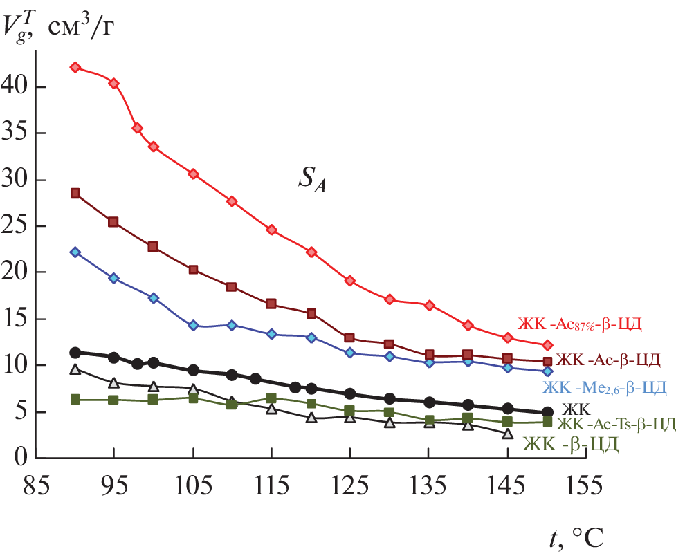 Using gas chromatography, we studied the influence of the nature of substituents in the β-cyclodextrin (CD) molecule on the sorption properties and the possibility of complex formation with the macrocycle of 26 organic compounds (hydrocarbons and alcohols) in binary sorbents based on the smectic–nematic supramolecular liquid crystal 4-(3-hydroxypropyloxy)-4'-formylazobenzene (HPOFAB) and four derivatives β-CD. It has been established that the nature of the substituents in the β-CD molecule significantly affects the manifestation of solvation interactions between LC and macrocyclic additive and, as a consequence, the mesomorphic, sorption, and selective properties of the studied composite sorbents.
