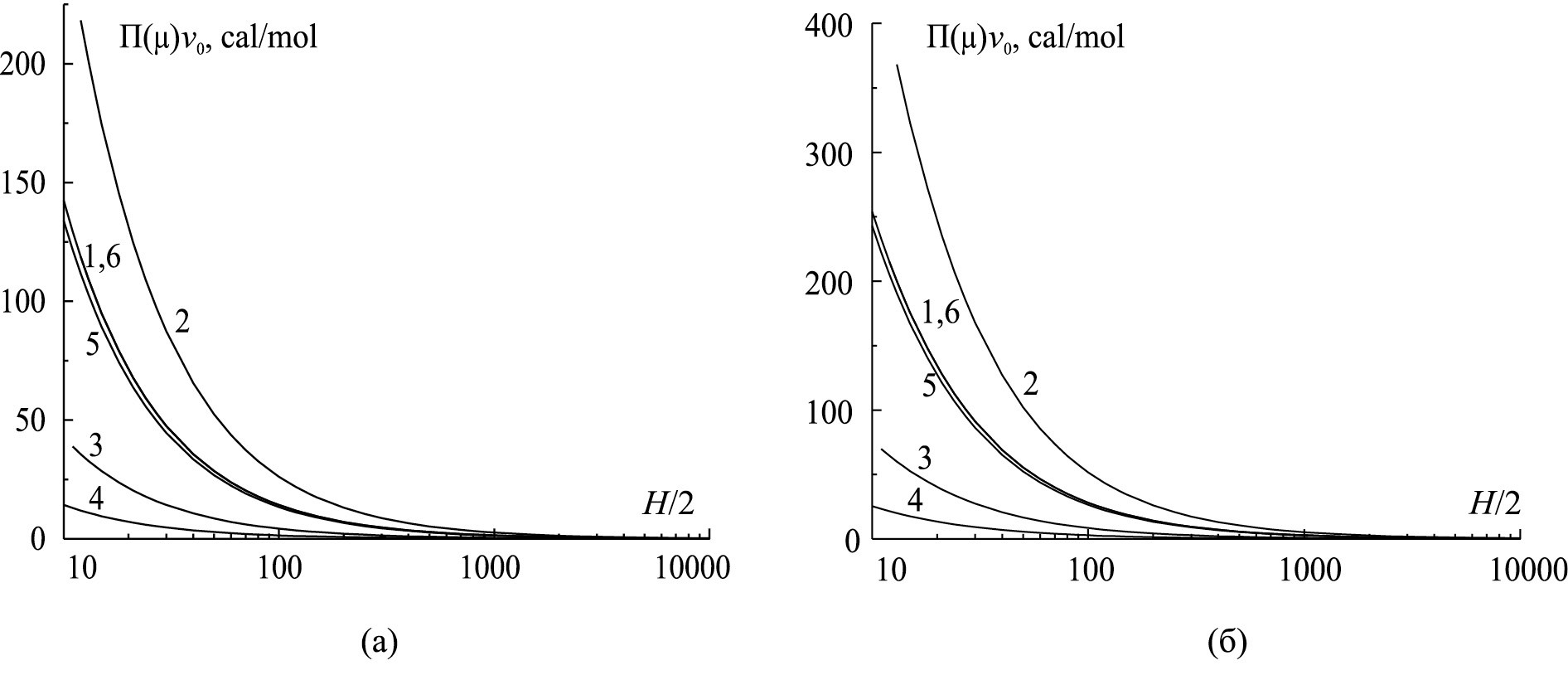 На рис. 2 показана зависимость расклинивающего давления, по определению (2), в щелевидной (рис. 2а) и цилиндрической (рис. 2б) порах при параметрах, перечисленных в табл. 1 (номера кривых определены в табл. 1), от ширины поры Н.