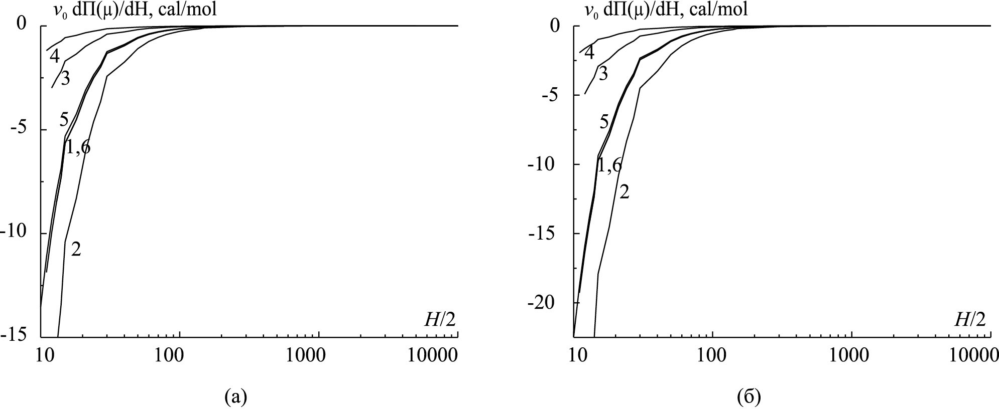 На рис. 3 показана зависимость производной расклинивающего давления, по определению (3), в щелевидной (рис. 3а) и цилиндрической (рис. 3б) порах при параметрах, перечисленных в табл. 1 (номера кривых расшифрованы в табл. 1), от ширины поры Н.