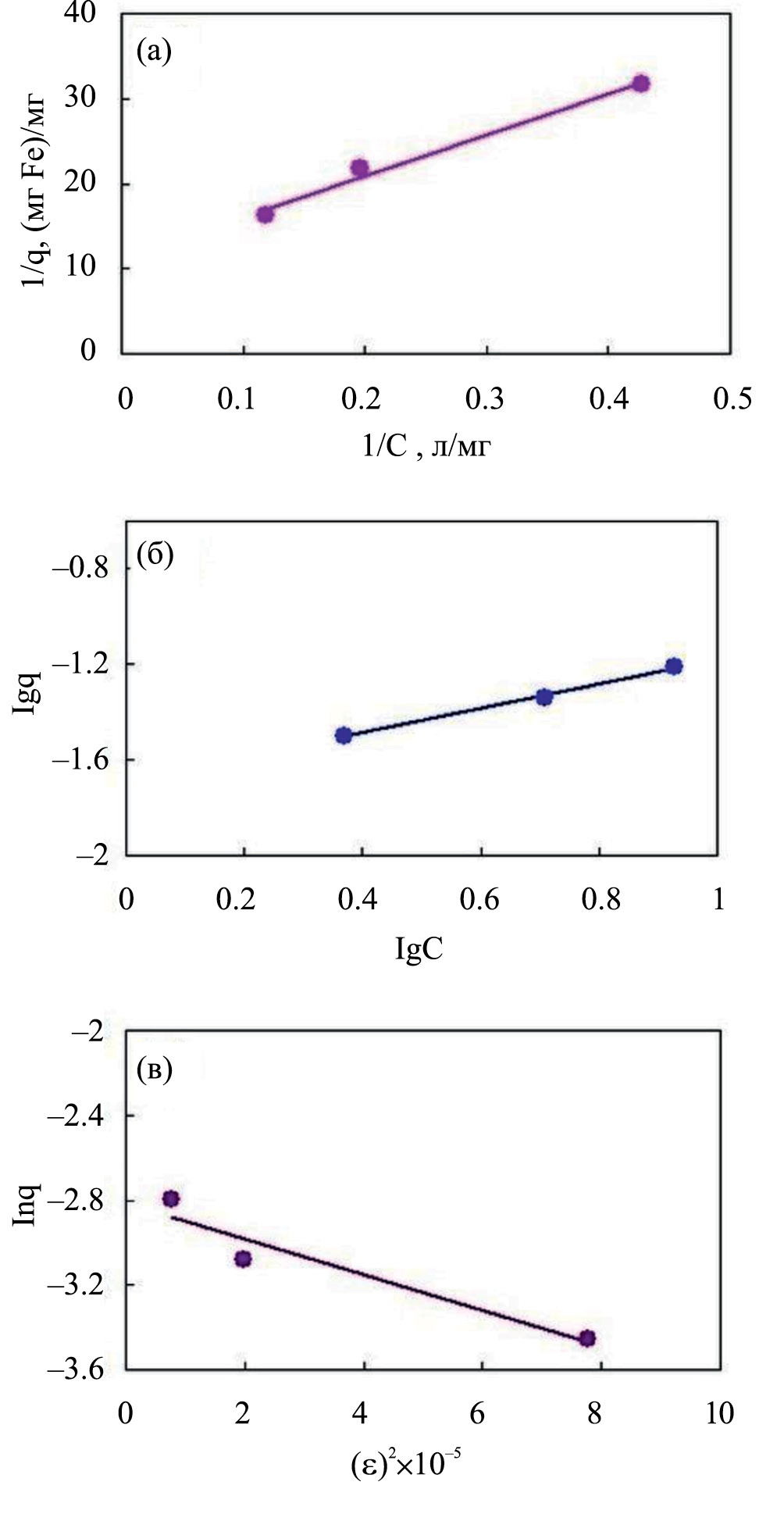 где q∞ – емкость адсорбционного монослоя сорбента, мг/(мг Fe); KL – константа адсорбционного равновесия, л/мг; KF – коэффициент пропорциональности; n – показатель степени (n > 1).