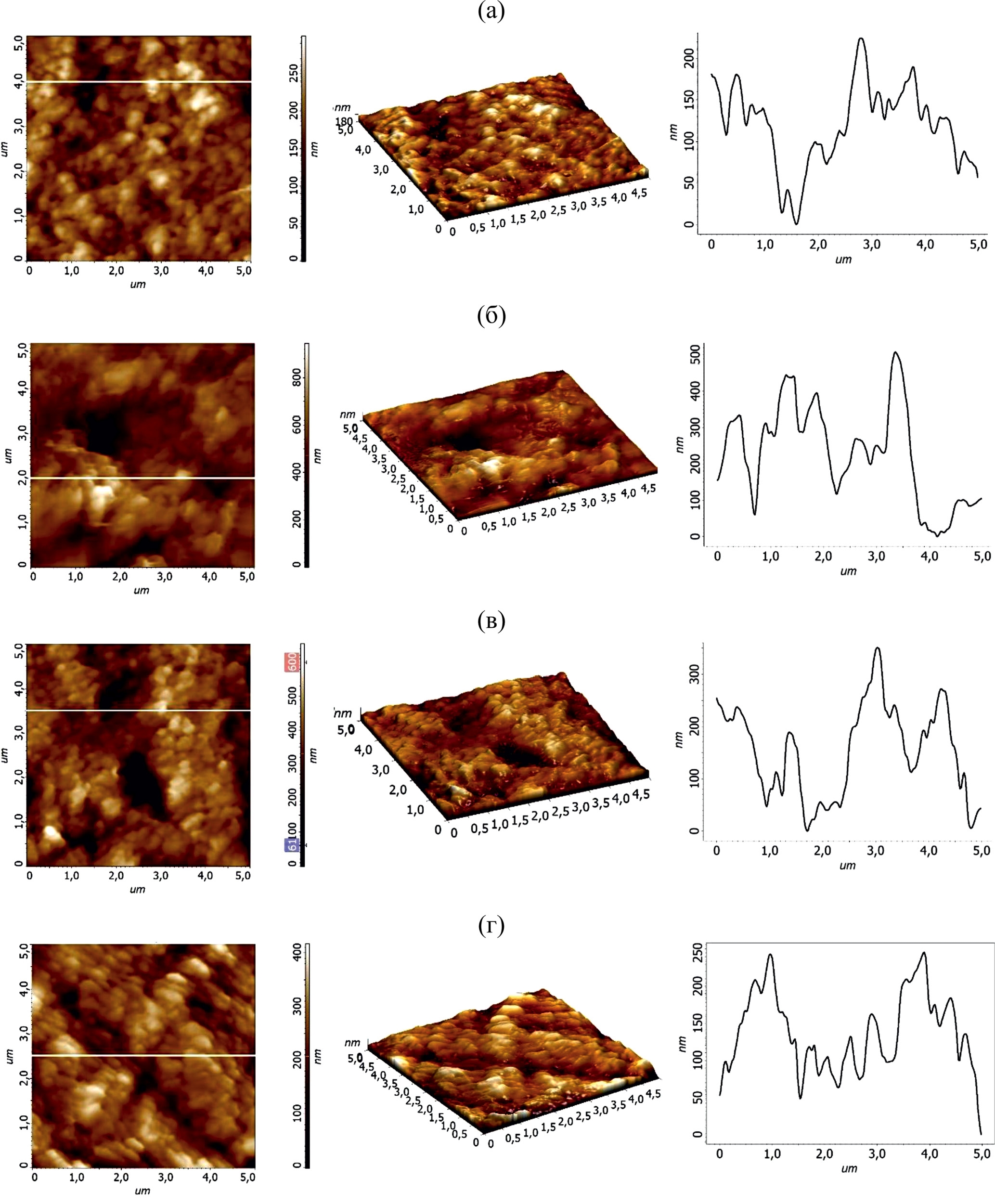 После термолиза приготовленные пленки исследовали методами краевых углов смачивания и атомно-силовой микроскопии (АСМ). Краевые углы у всех исследованных пленок были равны нулю, капли воды растекались по поверхности образцов, что свидетельствует о полной смачиваемости и супергидрофильности пленок. Известно, что шероховатость поверхности способствует улучшению смачиваемости пленок (при условии, что краевой угол смачивания гладких пленок из того же материала был меньше 90°) [32]. Результаты исследования шероховатости пленок методом АСМ приведены на рис. 8.