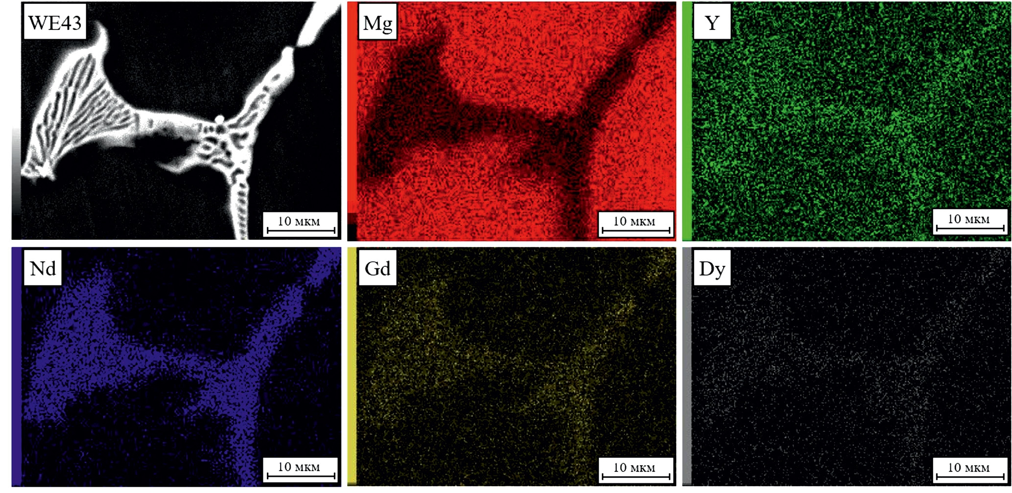 Для более детального изучения распределения элементов по поверхности сплава WE43 проведено элементное картирование. Карты распределения элементов по поверхности исследуемого образца представлены на рис. 2. Как видно из представленных элементных карт, легирующие компоненты сплава преимущественно распределяются по всей поверхности ИМЧ. Стоит отметить, что присутствие Y наблюдается не только в ИМЧ, но и в Mg-матрице. Это вызвано относительно хорошей растворимостью иттрия в магнии [43].