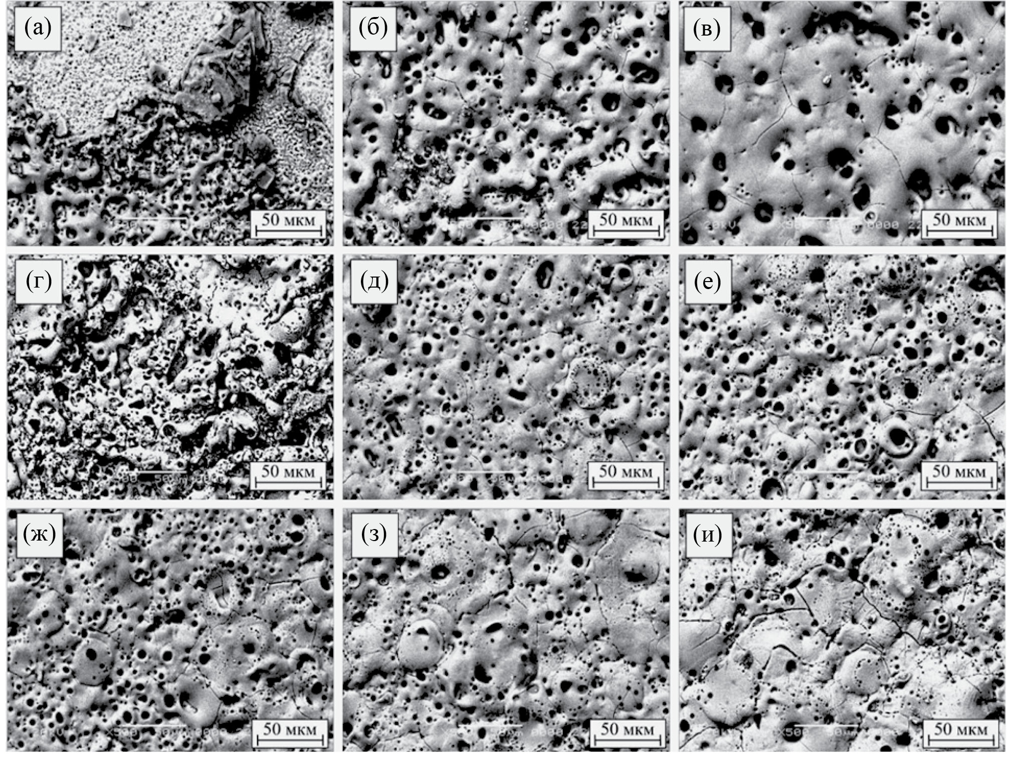 Рис. 4. СЭМ-изображения поверхности образцов сплава WE43 после ПЭО: Длительность обработки, с: (а, г, ж) - 300; (б, д, з) - 450; (в, е, и) - 600. Плотность тока импульса, А/дм²: (а-в) - 20; (г-е) - 30; (ж-и) - 40.