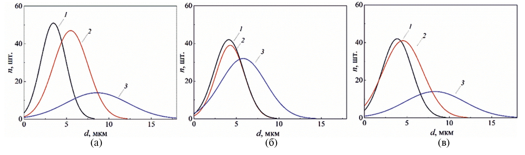 Рис. 5. Нормальное распределение диаметра пор покрытий, полученных при плотностях тока 20 (а), 30 (б) и 40 (в) А/дм²: Длительность электролиза, с: 1 - 300; 2 - 450; 3 - 600.