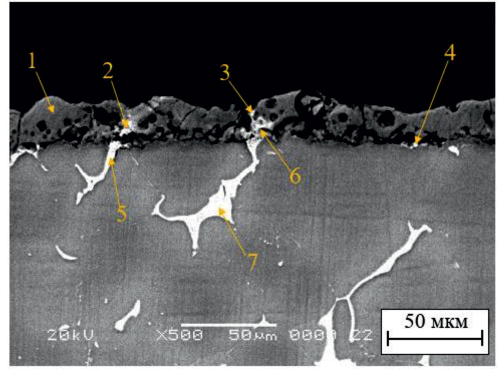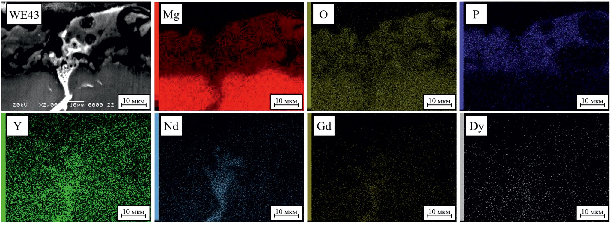 На рис. 6 представлено СЭМ-изображение поперечного шлифа образца WE43 с ПЭО покрытием. Необходимо отметить, что входящие в структуру сплава WE43 ИМЧ участвуют в формировании ПЭО покрытия, образуя обогащенные РЗЭ области (табл. 5). Элементные карты поперечного шлифа анодированного образца (рис. 7) указывают, что соединения легирующих РЗЭ сегрегируются в отдельных областях покрытия. Это, вероятно, вызвано быстрой кристаллизацией расплава в областях ИМЧ, приводящей к возникновению химически неоднородного по толщине покрытия.