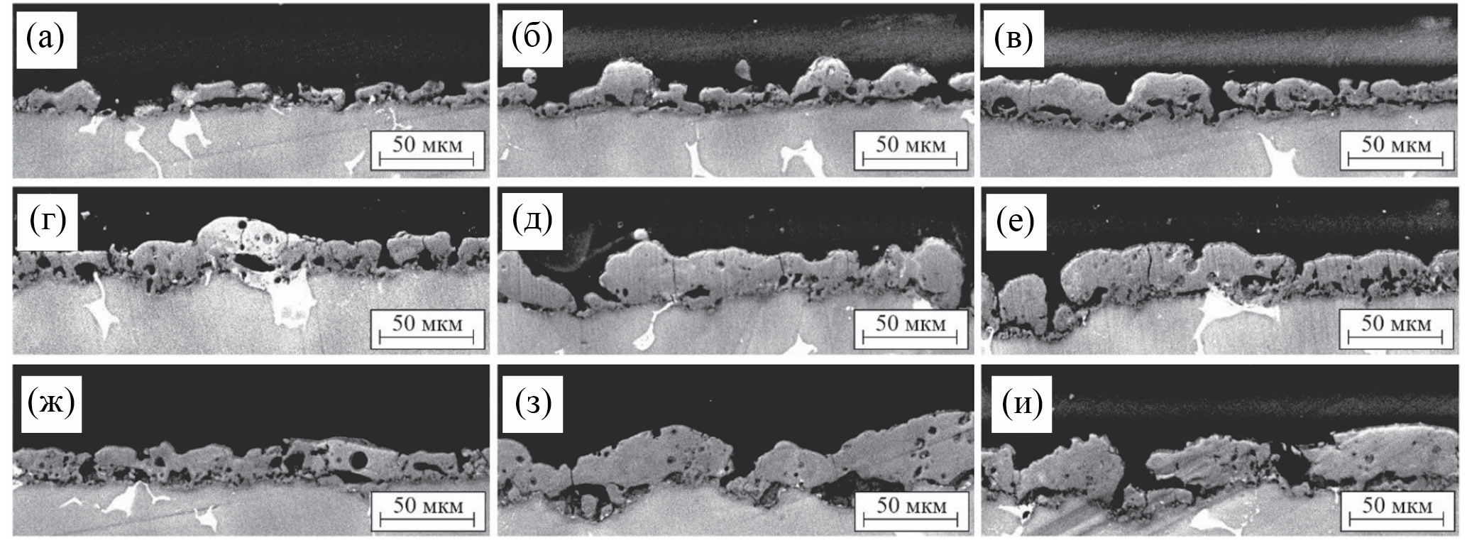 Рис. 8. СЭМ-изображения поперечных шлифов образцов сплава WE43 после ПЭО: Длительность обработки, с (а, г, ж) - 300; (б, д, з) - 450; (в, е, и) - 600. Плотность тока импульса, А/дм2: (а—в) - 20; (г—е) - 30; (ж-и) - 40.