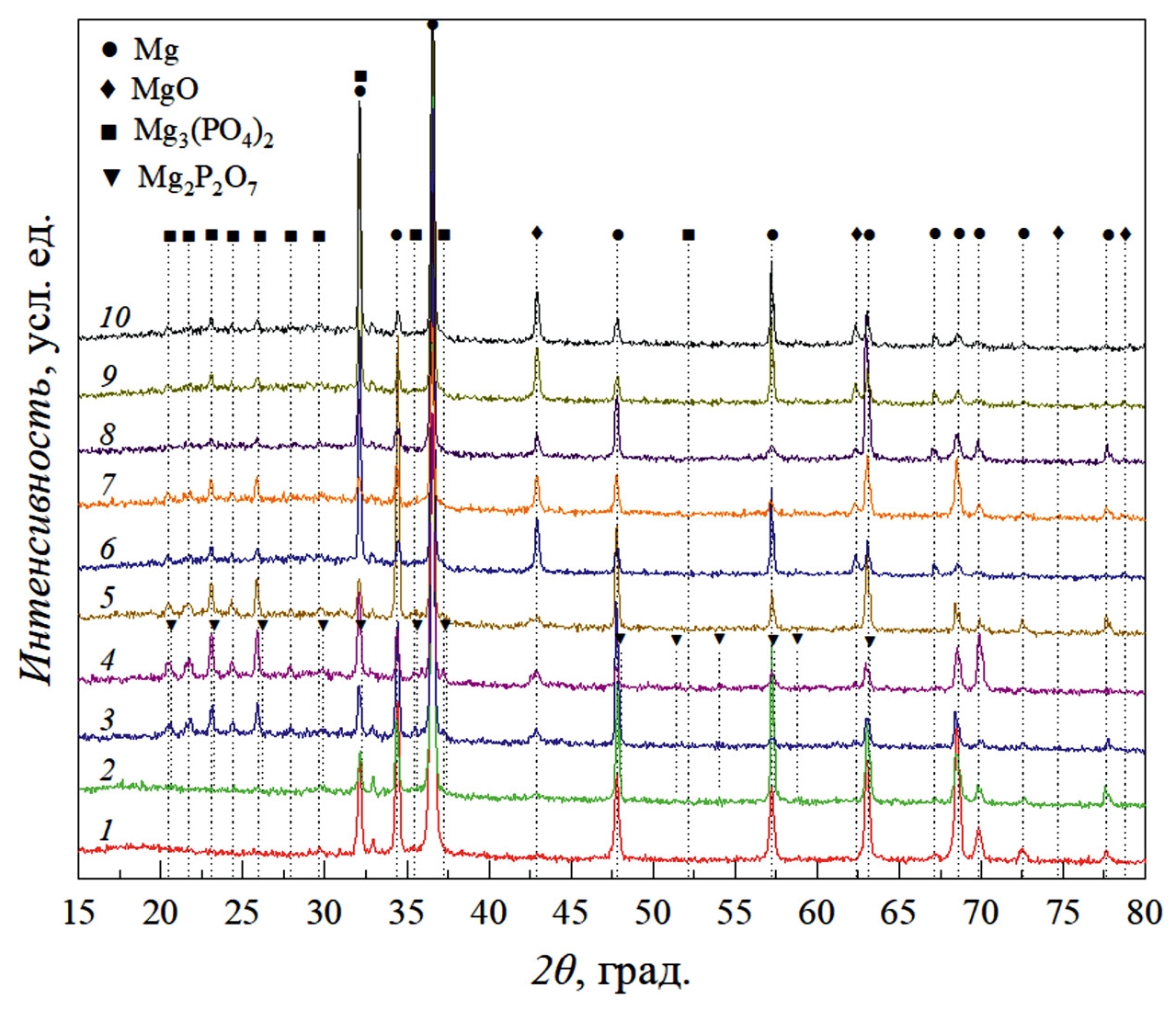 В табл. 4 представлены результаты элементного анализа поверхности образцов после ПЭО. Согласно полученным данным, поверхность образцов преимущественно состоит из Mg, O и P. Это, вероятно, свидетельствует о формировании анодно-оксидного покрытия, включающего оксиды и фосфаты магния. Как видно из табл. 3, в состав ПЭО покрытий входит незначительное количество легирующих добавок: Y (до 4.5 мас. %), Nd (до 1.4 мас. %), Gd (до 0.1 мас. %), Dy (до 0.1 мас. %).