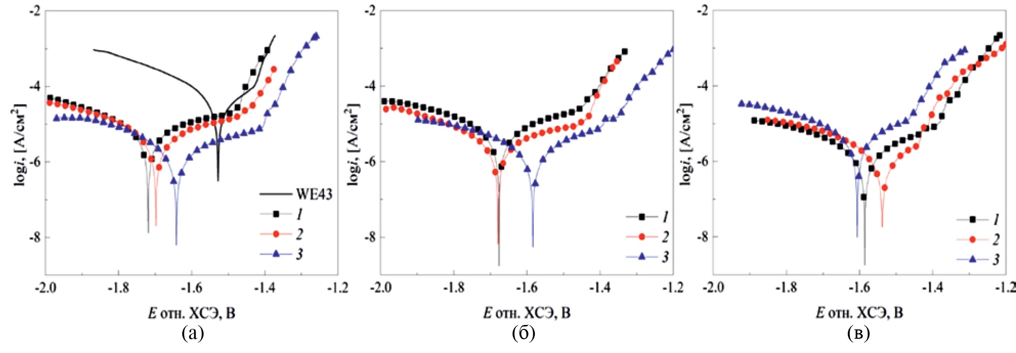 Поляризационные исследования в растворе Хэнкса показали, что ПЭО сплава WE43 способствуют уменьшению скорости его коррозии в 4.1–31.6 раза по сравнению с исходным образцом, что обусловлено образованием структурированного покрытия, ограничивающего контакт металла подложки с электролитом. Минимальная скорость коррозии наблюдается для образцов после 450 с электролитно-плазменной обработки, что, вероятно, вызвано структурными особенностями сформированного покрытия.