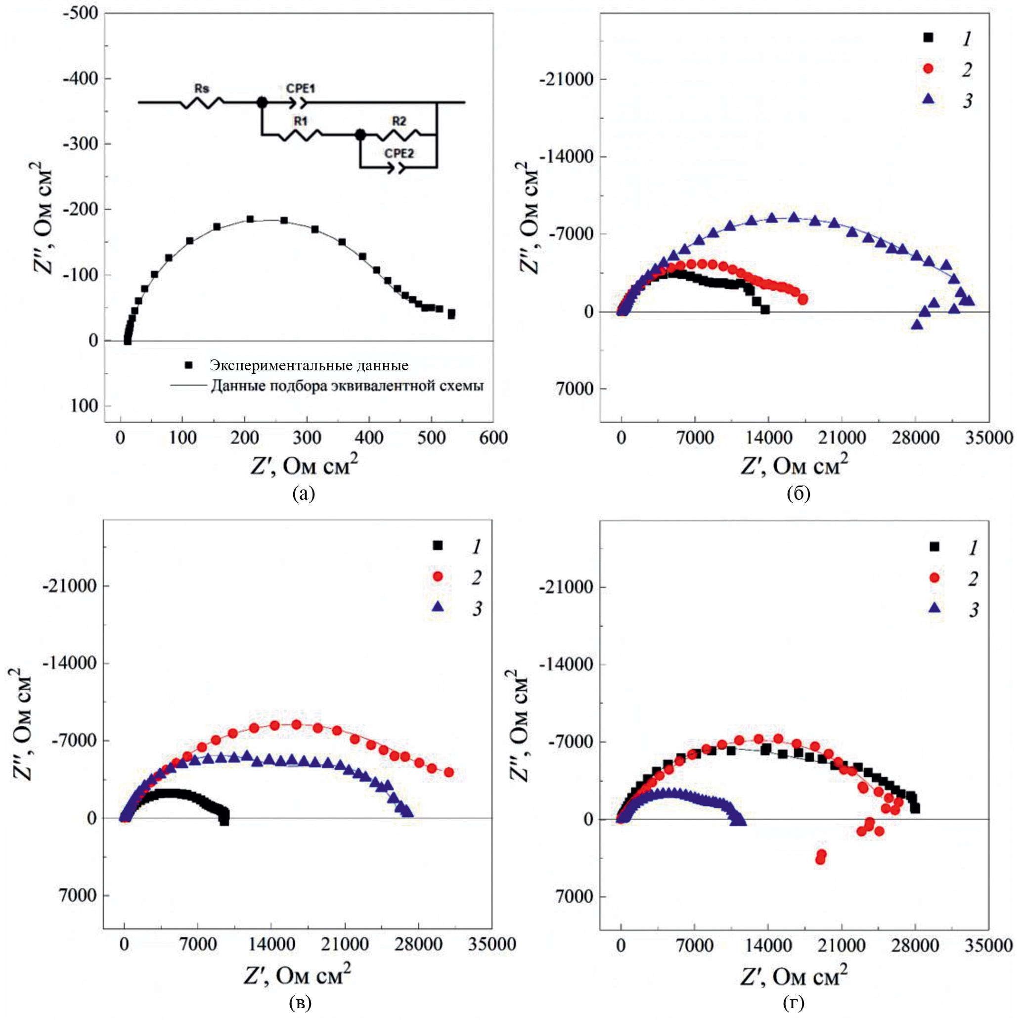 Результаты подбора спектров импеданса согласно предложенной эквивалентной схеме представлены на рис. 11(б–г) сплошными линиями.