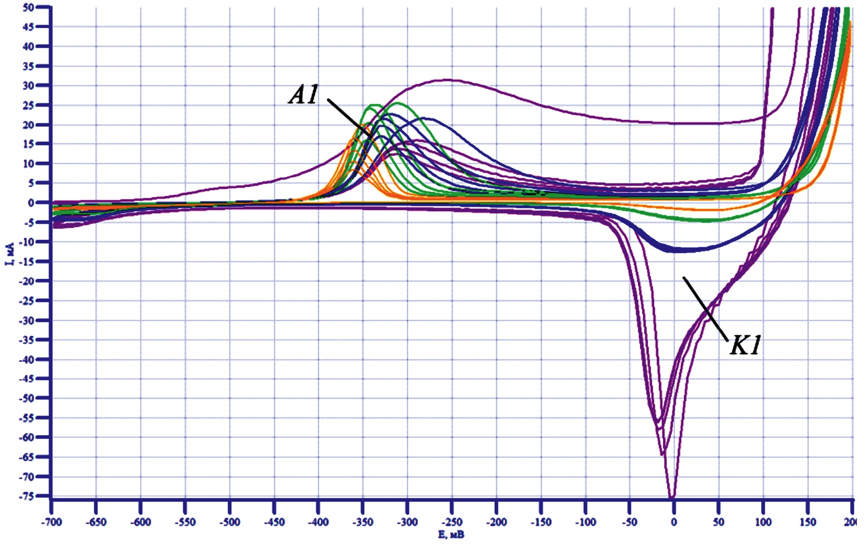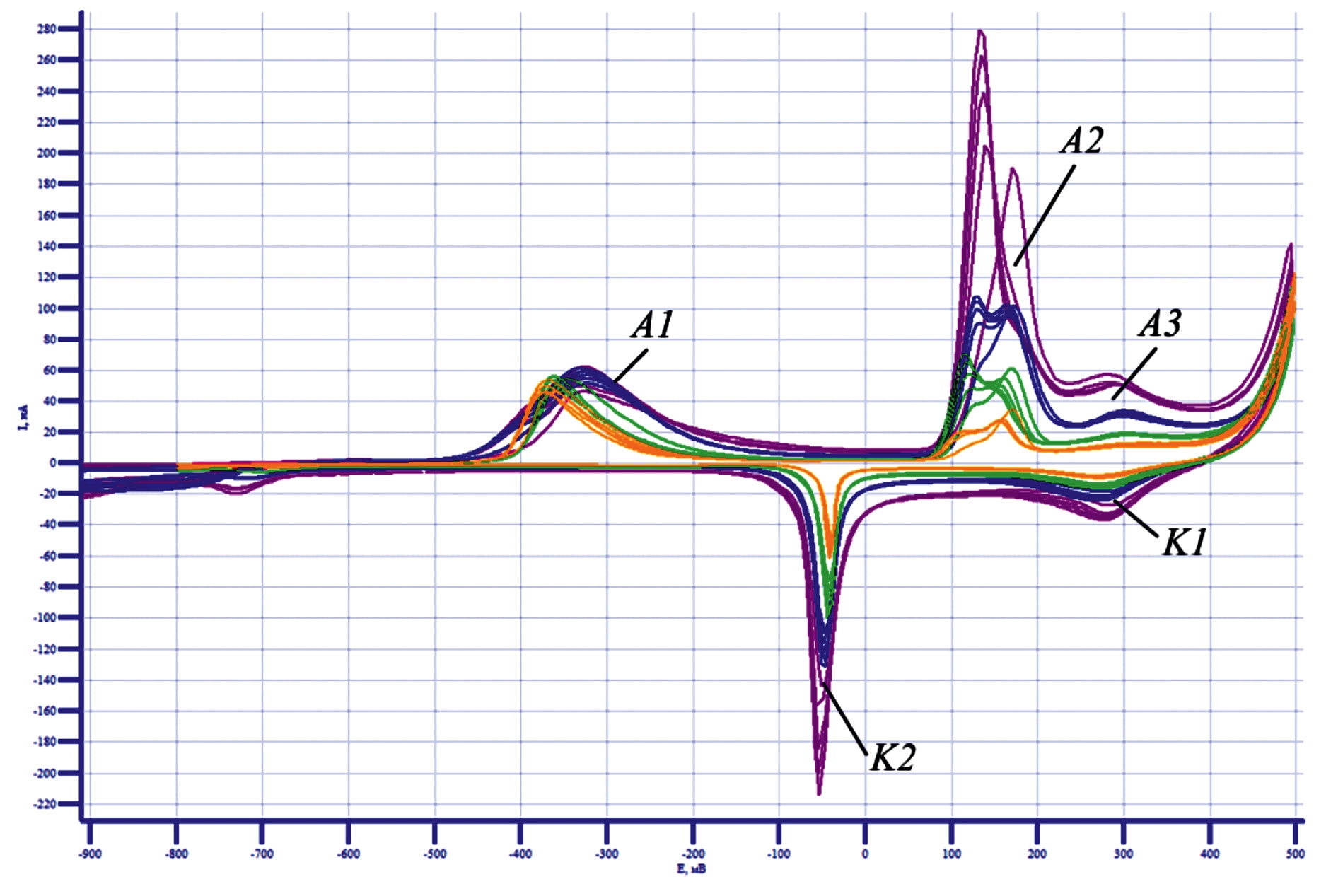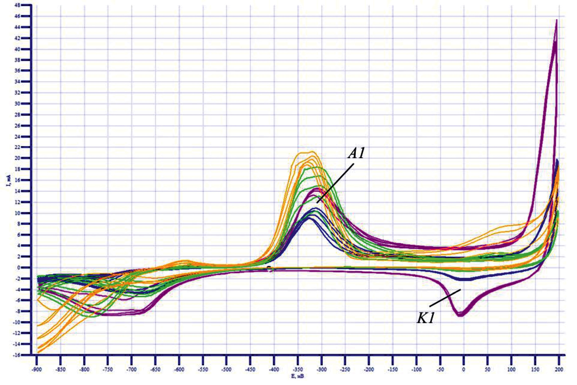 Анализ полученной CV-кривой для электрода Nifoam/Cu в растворе КОН, показал (рис. 2), что на анодной кривой видны 3 пика: первый (А1) при –350 мВ, второй (А2) при +150 мВ и третий (А3) при +280 мВ соответственно. При катодной развертке потенциала наблюдается два катодных пика: первый (К1) при +280 мВ и второй (К2) при –50 мВ.