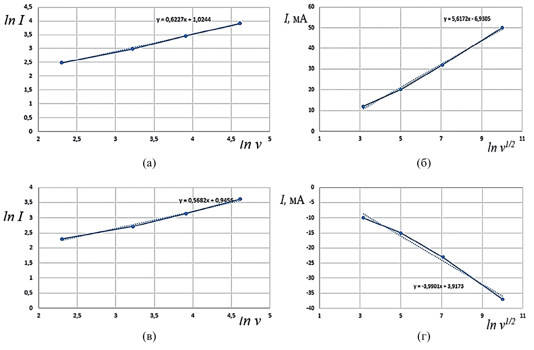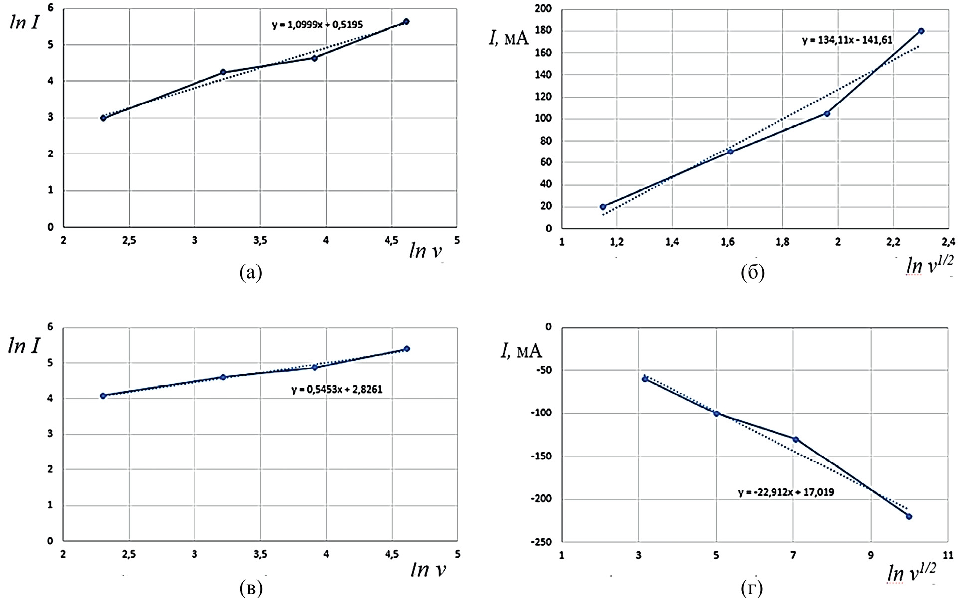 Рис. 4. Пиковые анодные А3 (а и б) и катодные К1 (в и г) токи на циклических вольтамперных кривых в зависимости от скорости развертки потенциала.