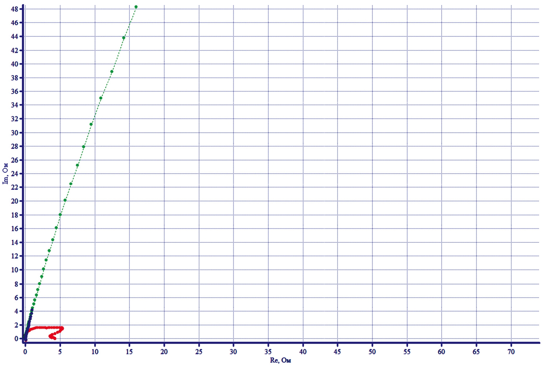 Рис. 5. Диаграмма Найквиста для NiFoam в KOH при потенциалах -375 мВ (красный), -40 мВ (зеленый), +150 мВ (голубой).