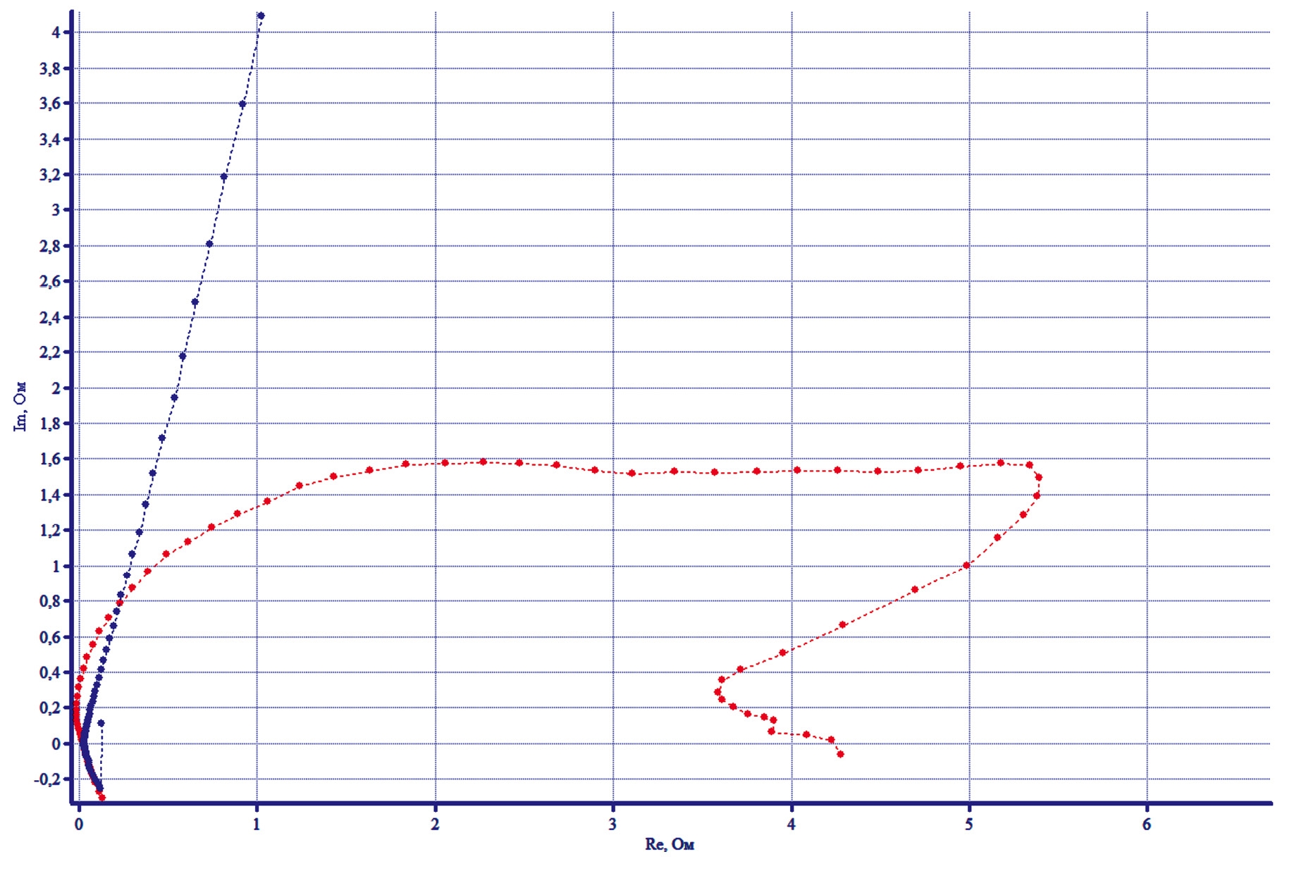 Рис. 6. Диаграмма Найквиста для NiFoam в растворе KOH при потенциалах -375 мВ (красный), +150 мВ (голубой).