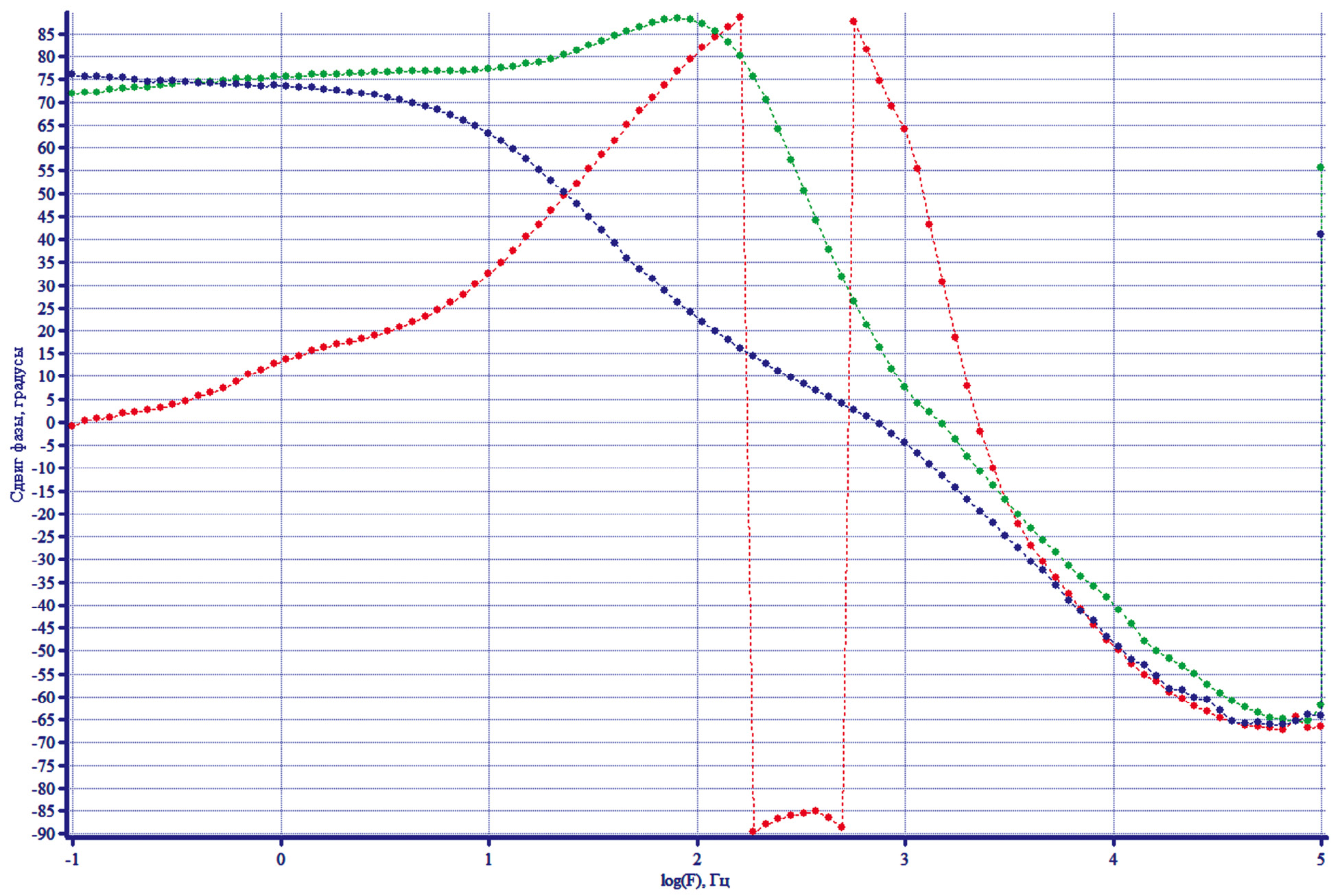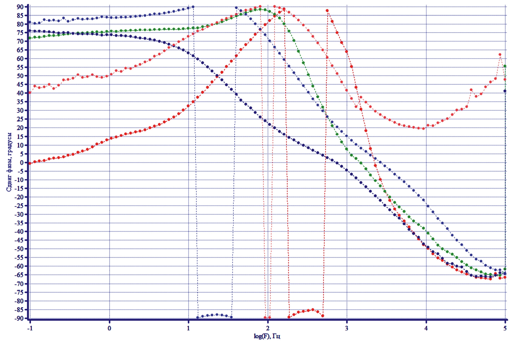 Рис. 7. Диаграмма Боде Nifoam/Cu в растворе КОН: при –375 мВ (красный), –40 мВ (зеленый), +150 мВ (голубой).