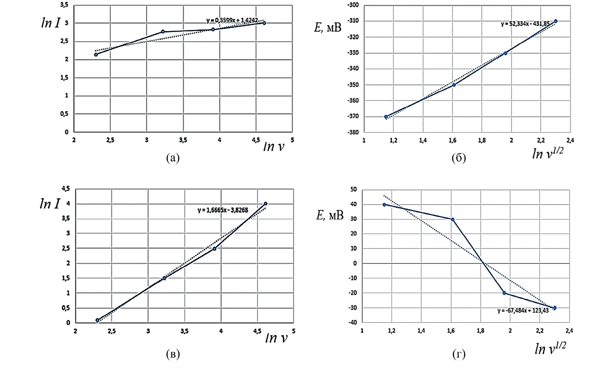 Рис. 9. Пиковые анодные А1 и катодные К1 токи на циклических вольтамперных кривых в зависимости от скорости развертки потенциала (а и в) и потенциалы анодных (б) и катодных (г) пиков.