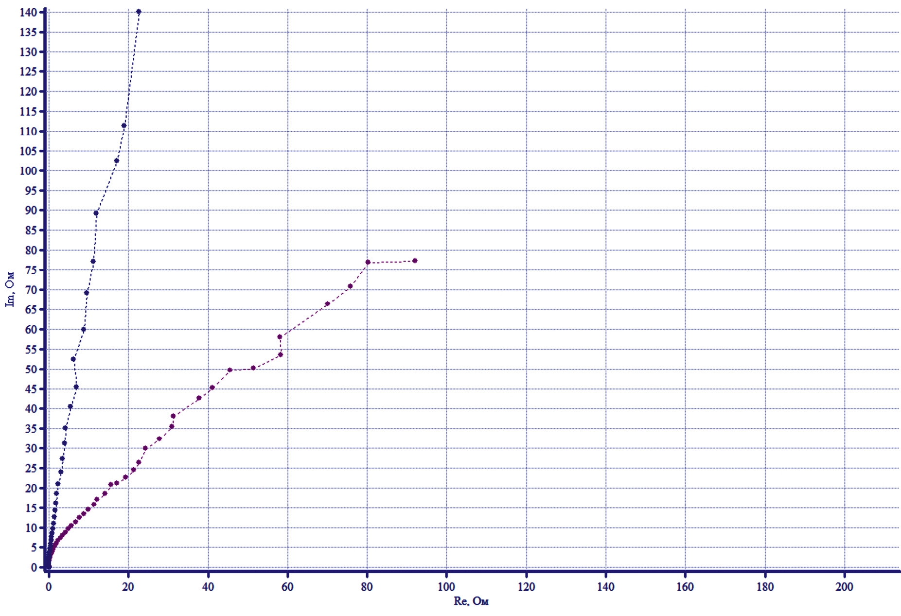 Рис. 10. Диаграмма Найквиста NiFoam/Cu в растворе KOH + этанол при потенциалах: -350 мВ (фиолетовый) и 0 мВ (голубой).