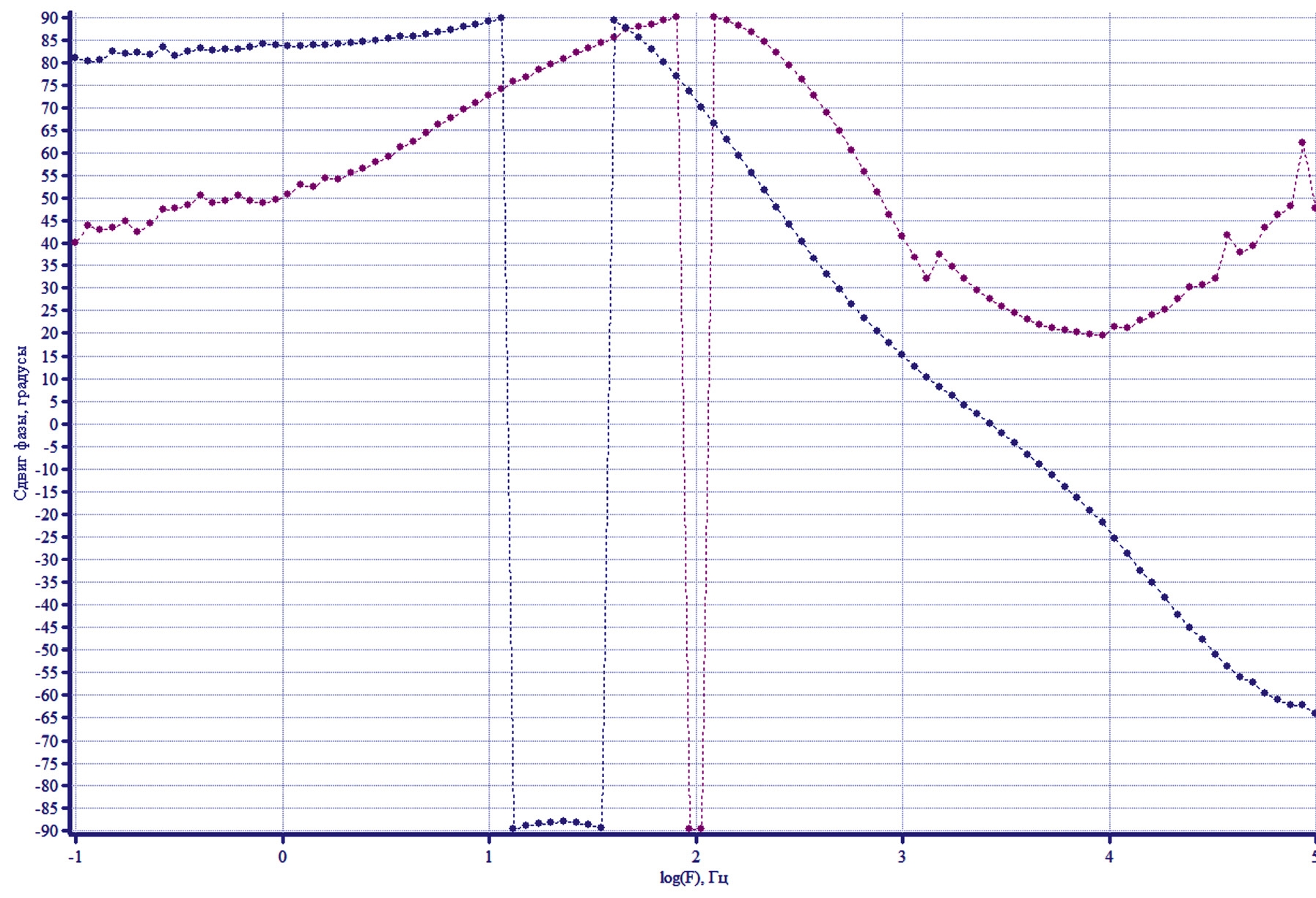 Рис. 11. Диаграмма Боде NiFoam/Cu в растворе KOH + этанол при потенциалах: -350 мВ (фиолетовый); 0 мВ (голубой).
