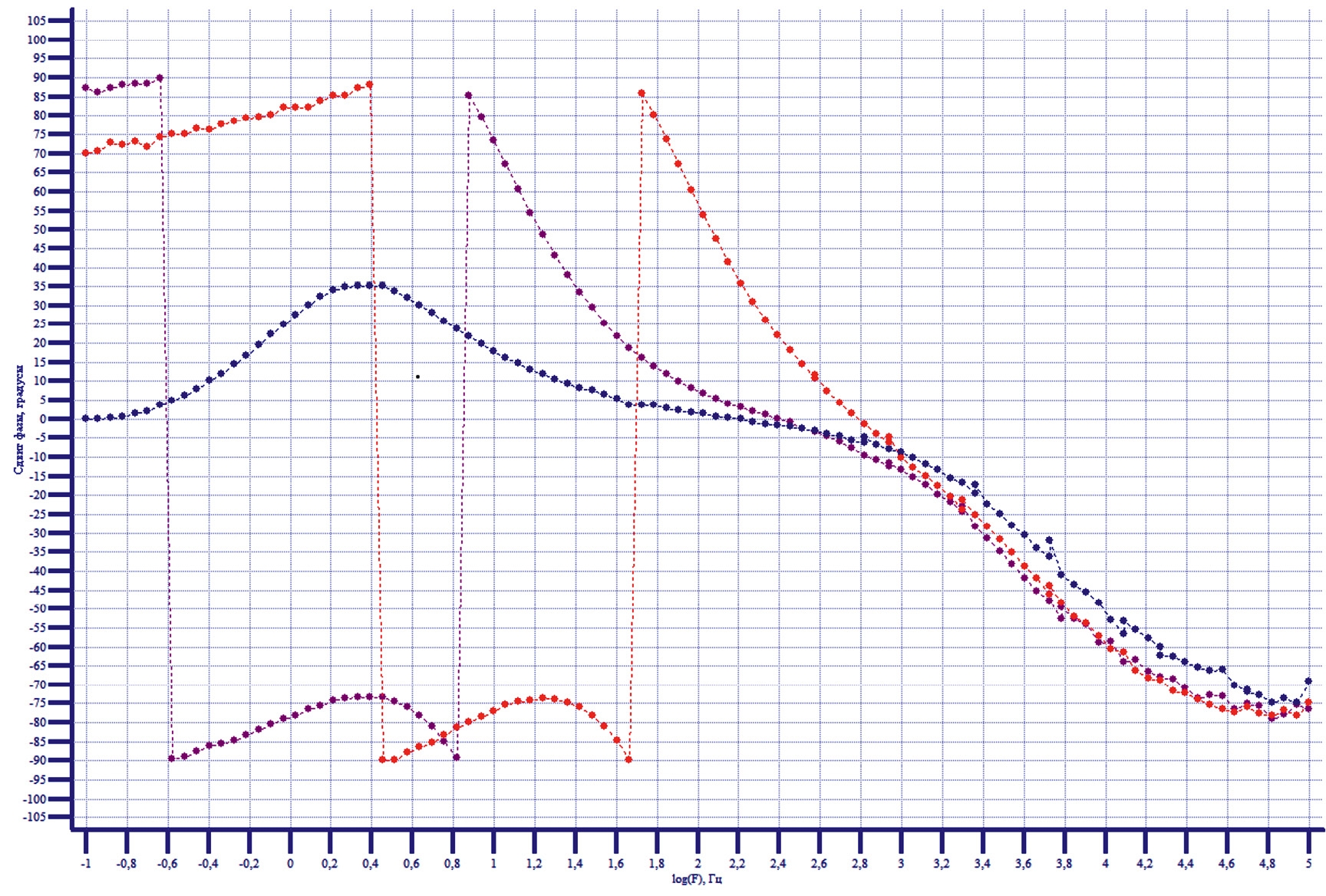 Рис. 14. Диаграмма Боде NiFoam/Cu в спиртовом слое при потенциалах: -325 мВ (красный), 0 мВ (фиолетовый), +150 мВ (голубой).