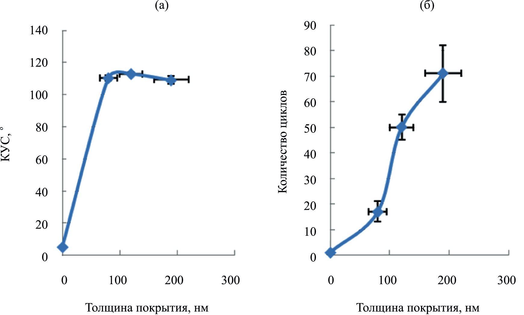 Рис. 1. Зависимость КУС (а) и количества циклов (б) от толщины покрытий на основе о-ГЕФС, сформированных на кремнии до удаления материала покрытия из зоны поверхностей и их повреждения.