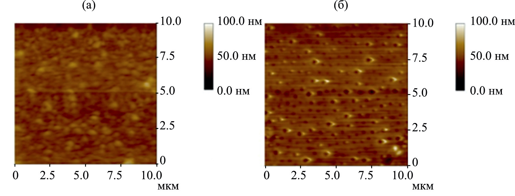 Рис. 2. АСМ-изображения покрытий из о-ГЕМС с КУС водой 106.8 ± 2.2° (а) и о-ГЕФС с КУС водой 113.1 ± 1.2° (б), сформированных на кремнии.