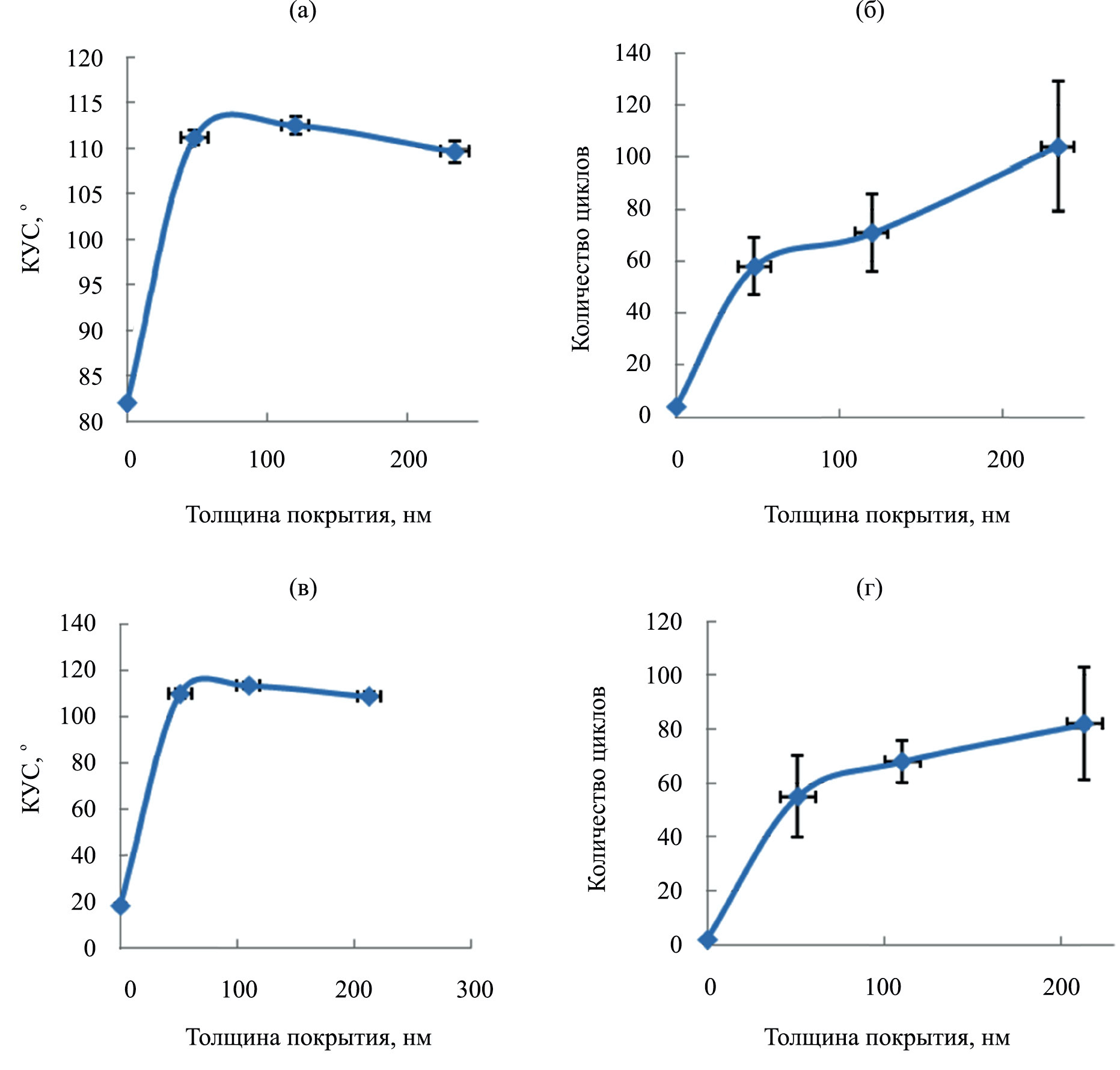 Рис. 3. Зависимость КУС (а, в) и количества циклов (б, г) от толщины покрытий на основе о-ГЕФС, сформированных на стали 12Х17 (а, б) и силикатном стекле (в, г) до удаления материала покрытия из зоны поверхностей и их повреждения.