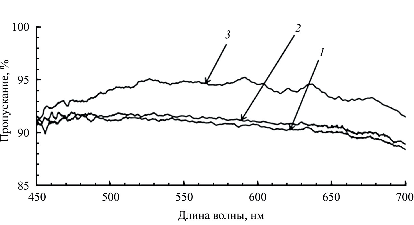 Необходимо отметить, что формирование на поверхности силикатного стекла о-ГЕМС не оказывает существенного влияния, а о-ГЕФС увеличивает его светопропускание в диапазоне длин волн от 450 до 700 нм (рис. 4). В частности, покрытие из о-ГЕФС с наибольшим значением КУС водой на силикатном стекле повышает его светопропускание при длине волны 550 нм с 91.2 ± 0.2 % до 94.8 ± 0.1 % (рис. 4, кривая 3).