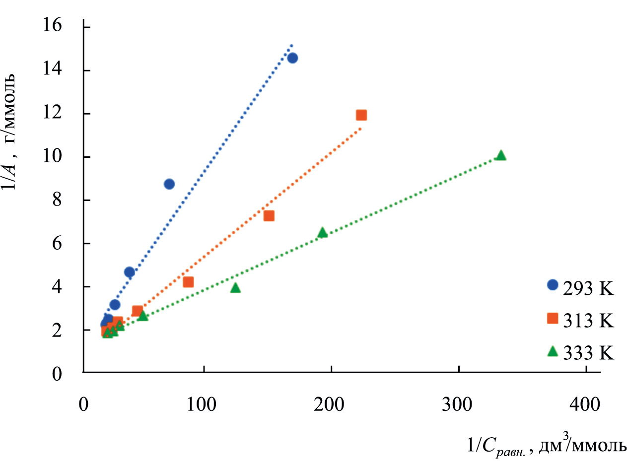 Экспериментальные данные обработали с помощью уравнения Ленгмюра, приведенного в линейной форме (рис. 2):