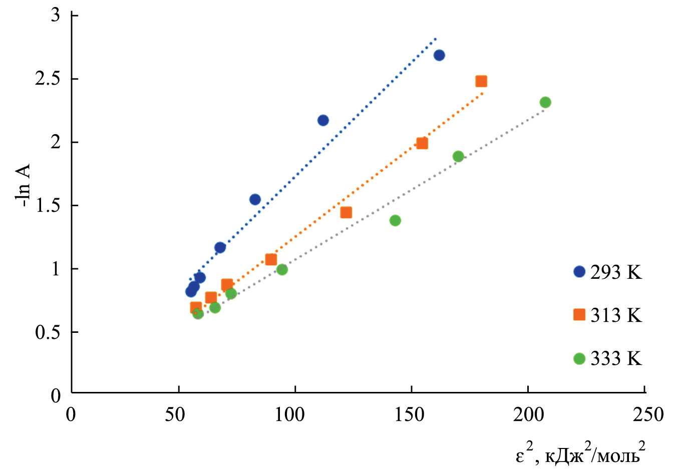 Используя уравнение адсорбции Дубинина–Радушкевича в линейной форме, построены зависимости ln A= f (ε2) (рис. 5).