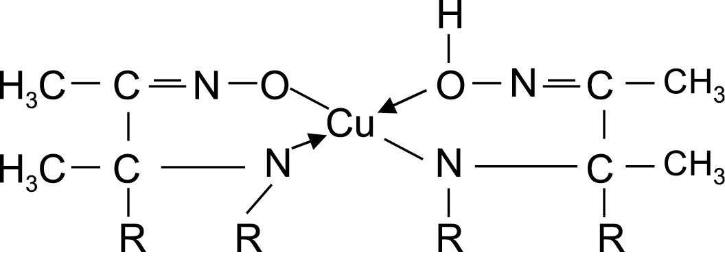 Однако такое объяснение механизма адсорбционного процесса противоречит результатам возрастания сорбционной емкости при повышении температуры. С нашей точки зрения, сорбция ионов меди(II) обусловлена наличием двух механизмов процесса [20]. На начальной стадии преобладает физический характер сорбции. Наличие делокализованных π-электронов, освобождающихся на краевых атомах разорванных боковых цепочек углерода и углеродных слоев, определяют его необычно высокую электронную проводимость, способствующую образованию равномерно заряженной поверхности, притягивающей катионы меди [21]. И далее протекает донорно-акцепторное взаимодействие, что можно отнести к активированной адсорбции. Поскольку медь является сильным комплексообразователем [22], она способна образовывать устойчивые хелатные соединения с поверхностными функционально-активными группировками сорбента. Такие кислород и азотсодержащие группировки преобладают на поверхности углеродных материалов, являющихся основой наших сорбентов [23]. Структура образующихся соединений исходя из брутто-формулы: (С-R-O)2-Сu может быть представлена в виде комплексного соединения (рис. 6).