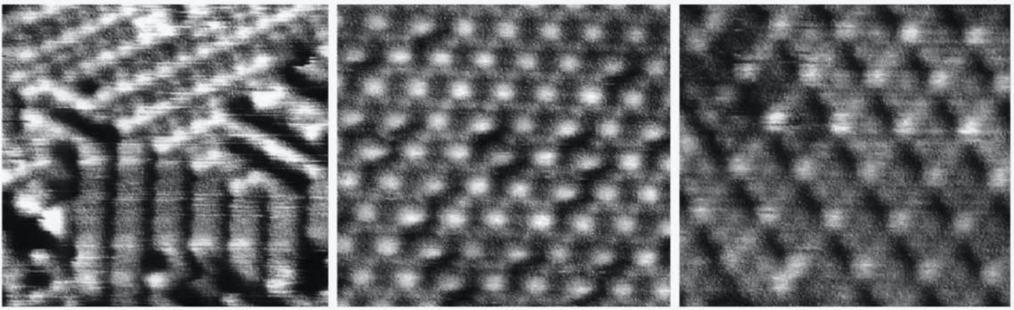 Более сложными примерами являются модельные реакции гетерогенного катализа на определенных гранях монокристаллов благородных металлов при низких парциальных давлениях в газовой фазе. Это реакции окисления монооксида углерода СO кислородом O2, а также редукция монооксида азота NO водородом Н2, аммиаком NН3 и монооксидом углерода (см. рис. 2). Обнаружены фазовые переходы типа порядок–беспорядок, сопровождающиеся образованием сверхструктур в монослое адсорбата, фазовые переходы типа расслоения на фазы, спонтанная и индуцированная адсорбатом реконструкция поверхности граней монокристаллов, коррозия катализатора. Процессы пространственно-временной самоорганизации, протекающие в нанометровой шкале размеров, тесно связаны с явлениями пространственно-временной самоорганизации, наблюдающимися с помощью эмиссионной фотоэлектронной микроскопии в микрометровом диапазоне. На рис. 2 в качестве примера представлены результаты исследования пространственно-временной самоорганизации в реакции окисления монооксида углерода на грани монокристалла методом эмиссионной фотоэлектронной микроскопии.