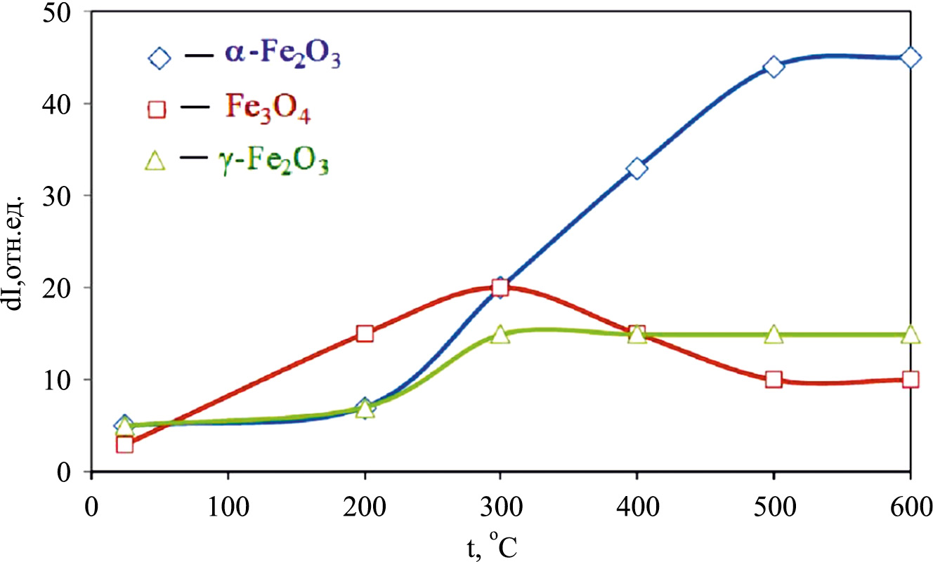 При росте температуры от 200° до 300°C интенсивность пика магнетита падает, а пика маггемита растет, что объясняется тем, что магнетит Fe3O4 превращается в наиболее термодинамически стабильную фазу окисла железа – гематит (α-Fe2O3) через промежуточную стадию образования маггемита (γ-Fe2O3) [12]:
