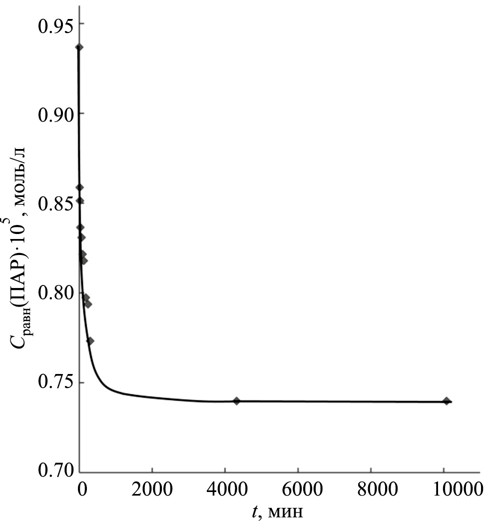 Изучение кинетики взаимодействия ПАР с частицами LaF3 в водной среде показало (рис. 3), что равновесие в системе при 20°C достигается в течение 72 ч. При этом уменьшение количества ПАР в растворе (степень связывания ПАР), вызванное его сорбцией на поверхности LaF3, составляет 21%. Таким образом, продолжительность всех экспериментов по сорбции составляла 72 ч.