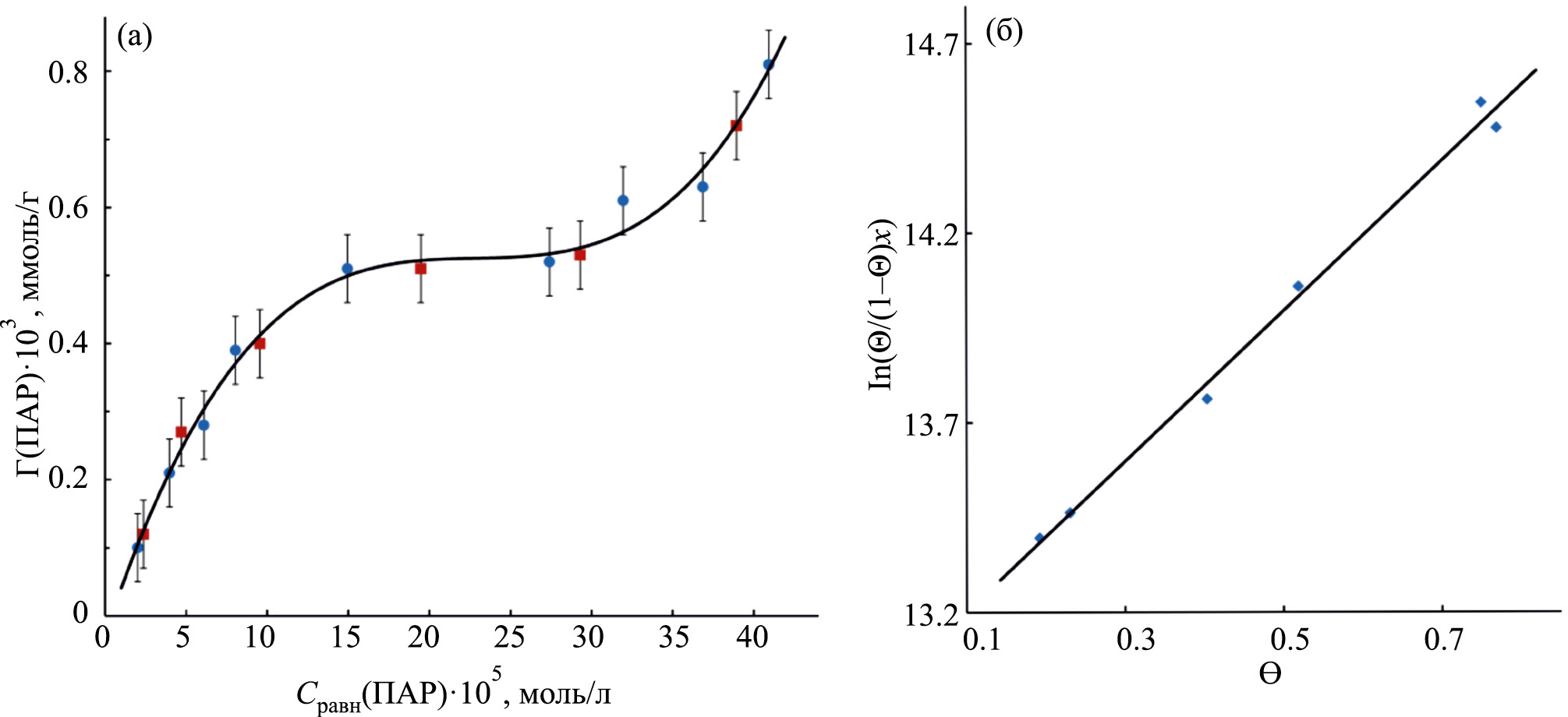 На основании полученных экспериментальных данных была построена графическая зависимость сорбции (Г, ммоль/г) ПАР от равновесной концентрации (Сравн, моль/л) ПАР (рис. 4а). Полученная зависимость может быть отнесена к классу изотерм L-3 (класс Лэнгмюра), имеющих сигмаобразную форму и представляющих наиболее общий класс изотерм. На полученной кривой можно выделить три участка. Первый — восходящий участок в диапазоне концентраций Сравн(ПАР) < 8.5∙10−5 моль/л, переходящий во второй, горизонтальный участок. В соответствии с теорией сорбции первый участок кривой соответствует формированию монослоя сорбата на поверхности твердого тела. Завершение заполнения монослоя выражается выходом изотермы на плато. Затем на изотерме сорбции следует третий, восходящий участок, который может быть вызван перестройкой монослоя, связанной с его уплотнением и сопровождаемой дополнительной сорбцией сорбата, и полислойной сорбцией, обусловленной взаимодействием сорбат — сорбат.