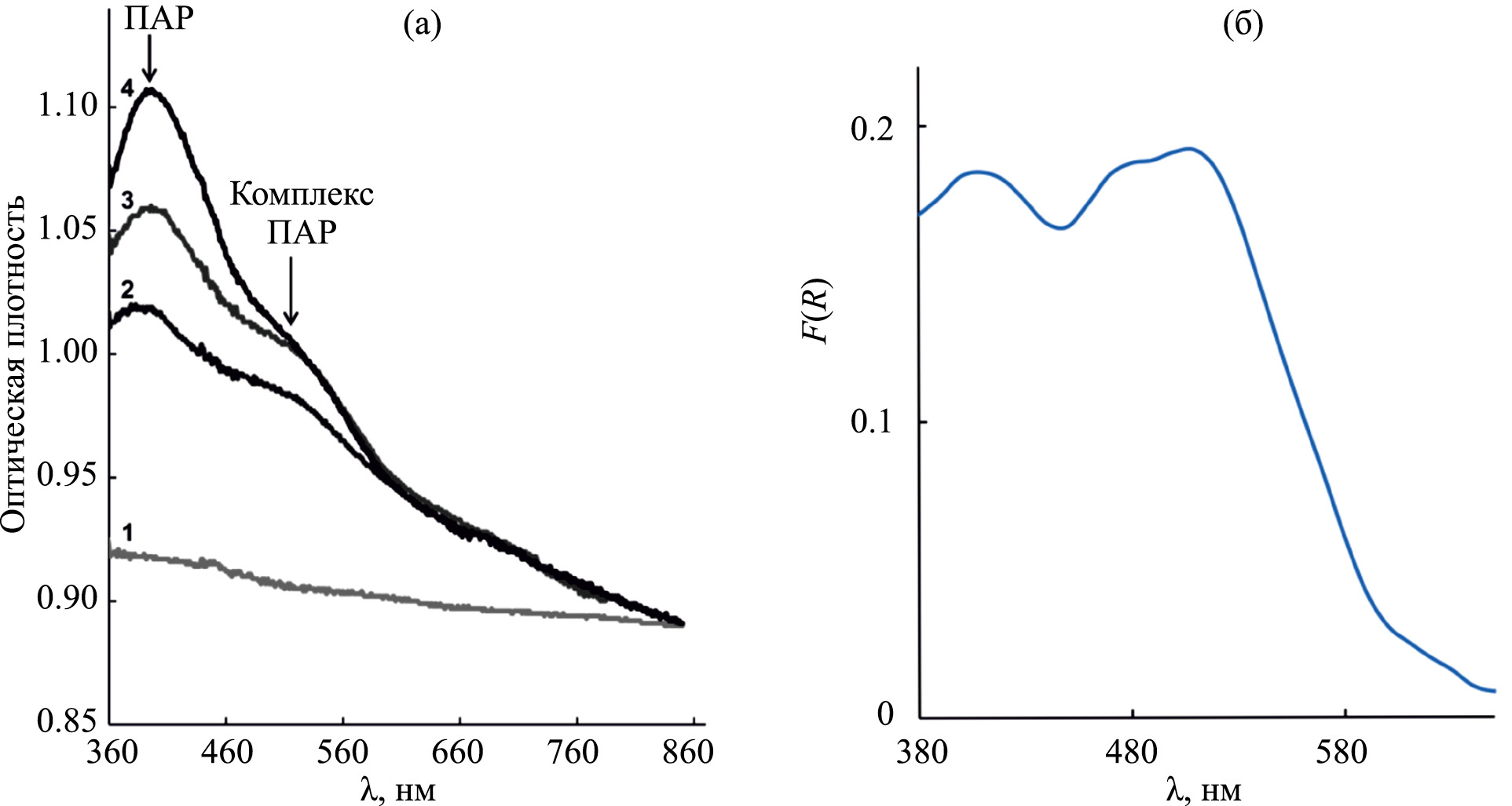 Рис. 5. Спектры поглощения суспензий LaF3 в глицерине (а), соответствующие разным участкам изотермы сорбции 4-(2-пиридилазо)резорцина: 1 — до сорбции; 2 — первый (восходящий) участок, Г = 1.0·10–3 ммоль/г; 3 — второй участок (плато), Г = 3.9·10–3 ммоль/г; 4 — третий (восходящий) участок, Г = 8.1·10–3 ммоль/г; и типичный спектр диффузного отражения образца LaF3 после сорбции 4-(2-пиридилазо)резорцина (б).