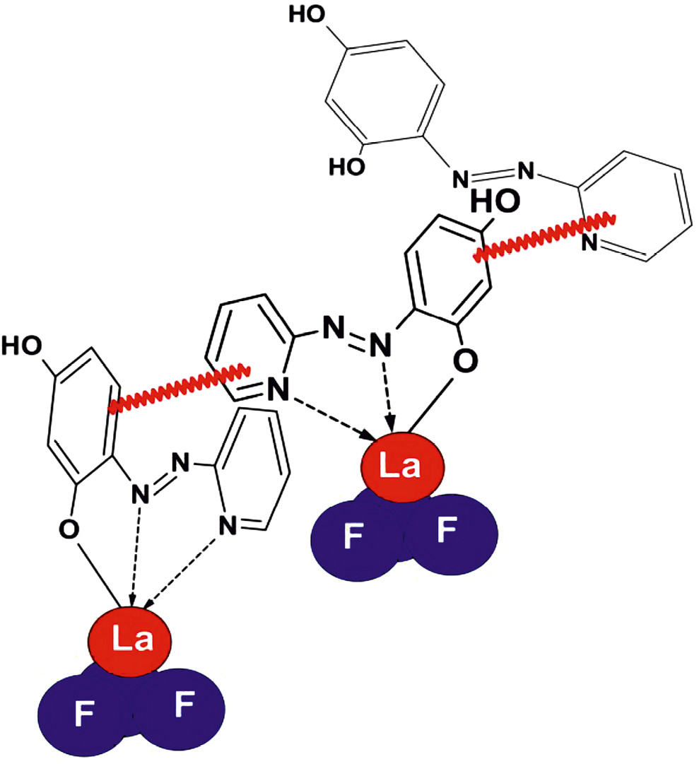 Рис. 6. Схема латеральных взаимодействий несвязанных и связанных с поверхностью LaF3 молекул 4-(2-пиридилазо)резорцина.