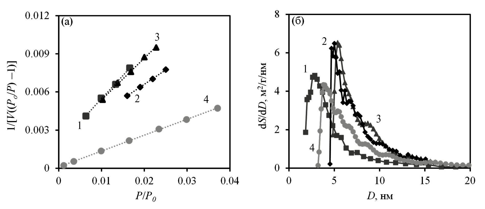 Рис. 1. Графики БЭТ (а) и NL-DFT (б) для образцов ПАН-MA/УМ-250–1000, (квадраты) (1); ПАН-MA/УМ-250/Zn-1000, (ромбы) (2); ПАН-MA/УМ-350–1000 (треугольники) (3); ПАН-MA/УМ/Zr-350/Zn-1000 (круги) (4).