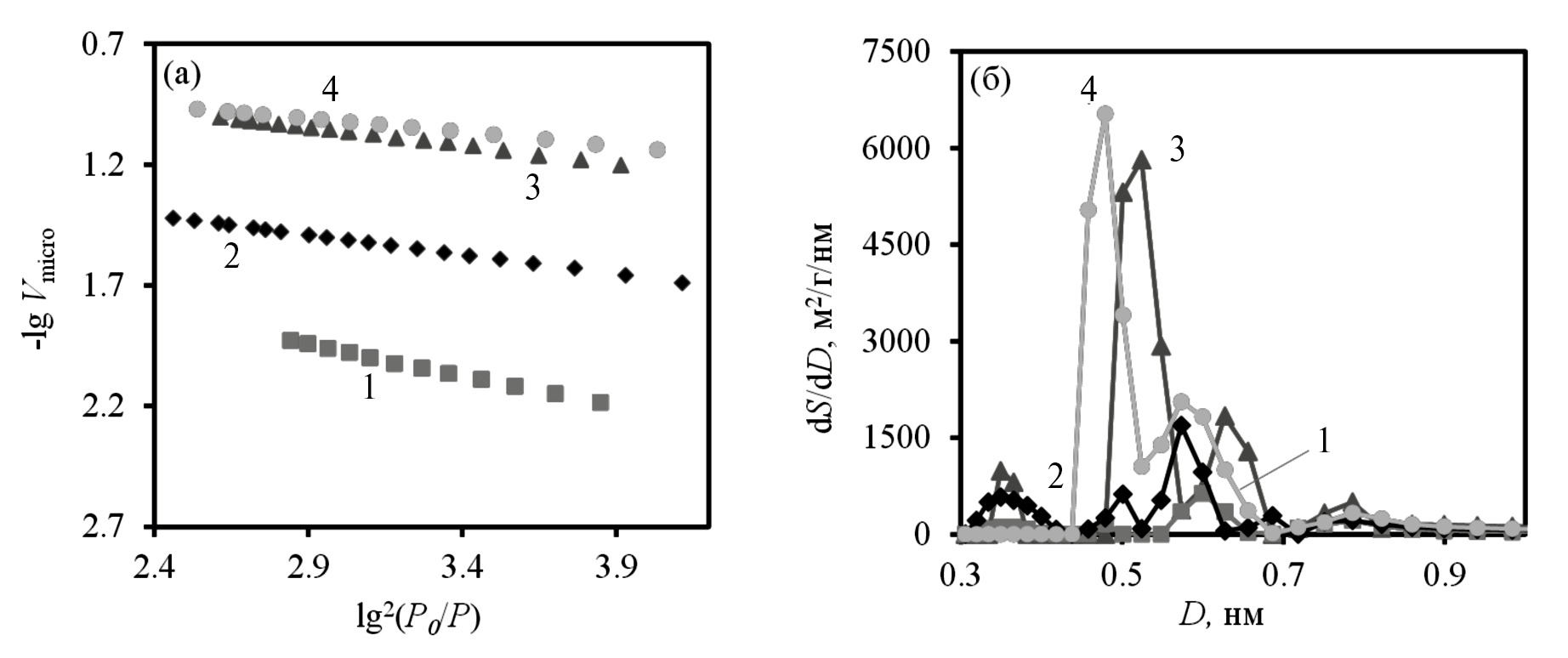 Изотермы адсорбции СО2 были получены на анализаторе удельной площади поверхности и пористой структуры 3P Micro 200 (3P Instruments, Германия) при температуре 273 K и давлении 10–3 – 1 бар. Теория Дубинина-Радушкевича и нелокальная теория функционала плотности (NL-DFT) были применены для полученных изотерм адсорбции СО2 с использованием программного обеспечения NovaWin, version 11.04, Quantachrome Instruments (площадь поперечного сечения для молекулы СО2 была принята равной 0.210 нм2, плотность адсорбируемого СО2 1.044 г/мл, давление насыщенных паров адсорбата p0 3.485 МПа при 273 К, коэффициент аффинности β 0.35 [58]). Распределение пор по размерам было получено в соответствии с методом NL-DFT.