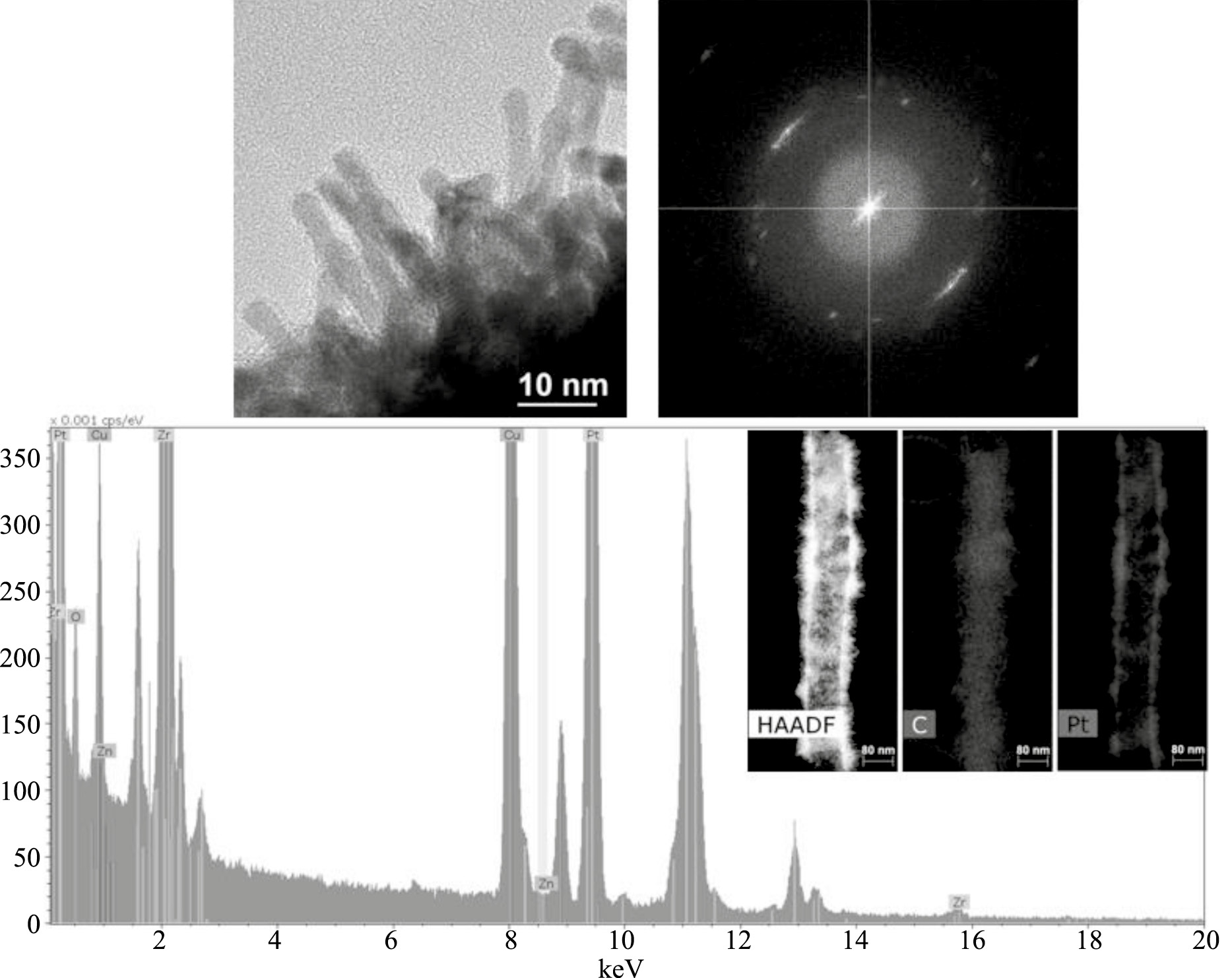 Рис. 7. ВРЭМ-изображение платиновых частиц на поверхности волокна и Фурье-дифрактограмма (сверху) от игольчатых кристаллов; HAADF-изображение волокна, карты распределения углерода и платины в нем, ЭДС-спектр, полученный от данного участка (снизу) для образца 4 после платинирования.