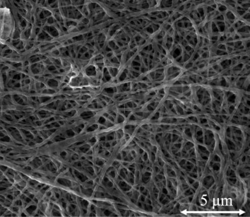 Композитные нановолокна на основе сополимера акрилонитрила с метилакрилатом были получены методом электроспининга (со струны) по разработанной технологии NanospiderTM. Процесс электроспининга проводился на установке NS Lab NanospiderTM (Elmarco, Чехия) при относительной влажности 8% и напряжении 50 кВ, с расстоянием между электродами 180 мм из раствора с содержанием 5.4 г сополимера акрилонитрил-метилакрилат (ПАН-МА; Mw = 85·103 Da, (Goodfellow, Великобритания) содержание метилакрилата (МА) 5.8 масс.%), 0.3 г сажи УМ-76 (5.5 масс.% относительно сополимера) и 0.029 г хлорида циркония (IV) (~0.5 масс.% относительно сополимера), диспергированных в 50 мл ДМФА в ультразвуковой бане в течение 3 ч (ПАН-MA/УМ/Zr). Также, были изготовлены образцы без содержания Zr (ПАН-MA/УМ).
