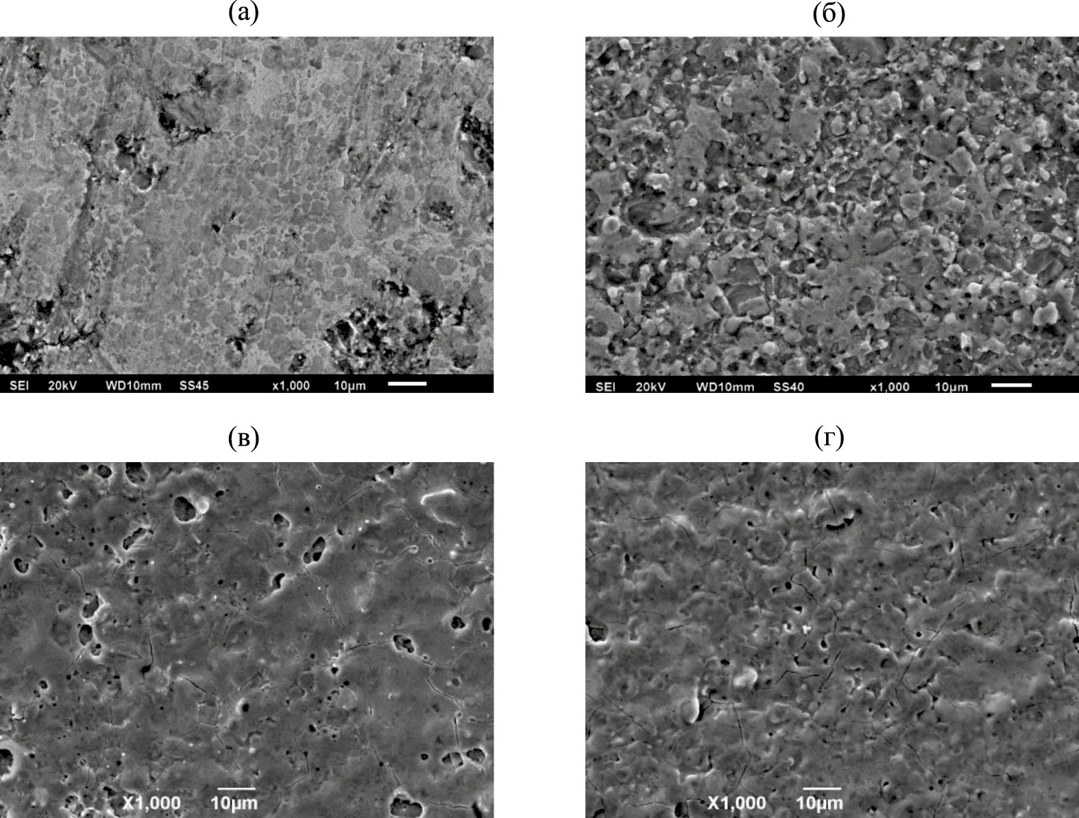Рис. 1. РЭМ изображения поверхности БВТС (50% TiC–50% TiNi) в исходном состоянии (а), после одного (б), двух (в) и пяти (г) импульсов облучения МИП.